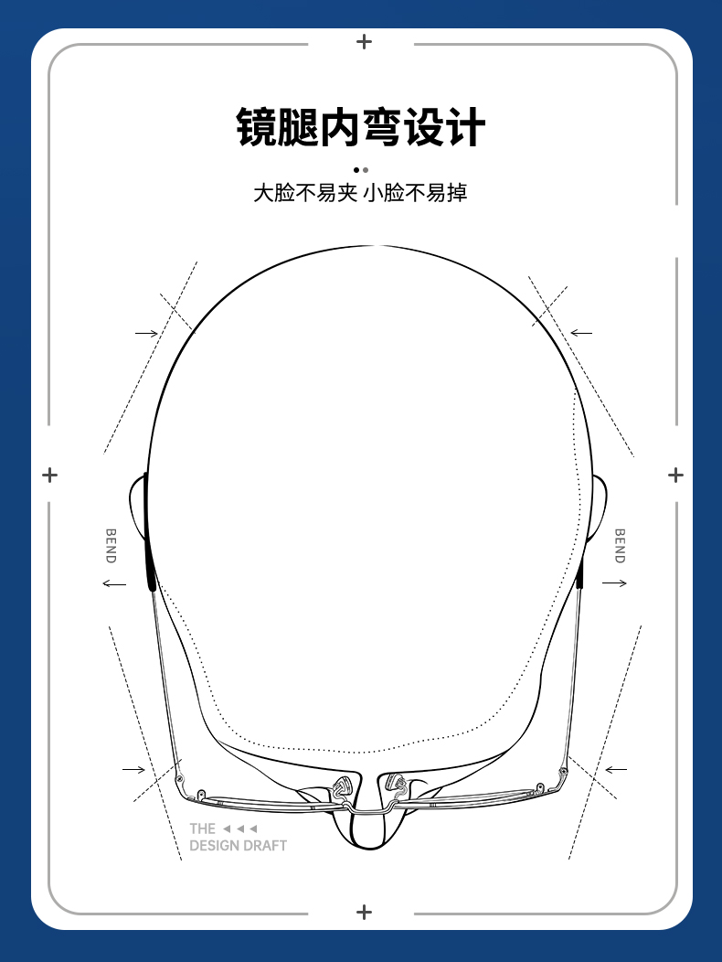 镜架有7°向内倾角,改变镜架在鼻梁上的重心点,防止眼镜框下滑。 弯折连接处开合自如不夹脸,双层软硅鼻托,减压无红印、支撑力度强。