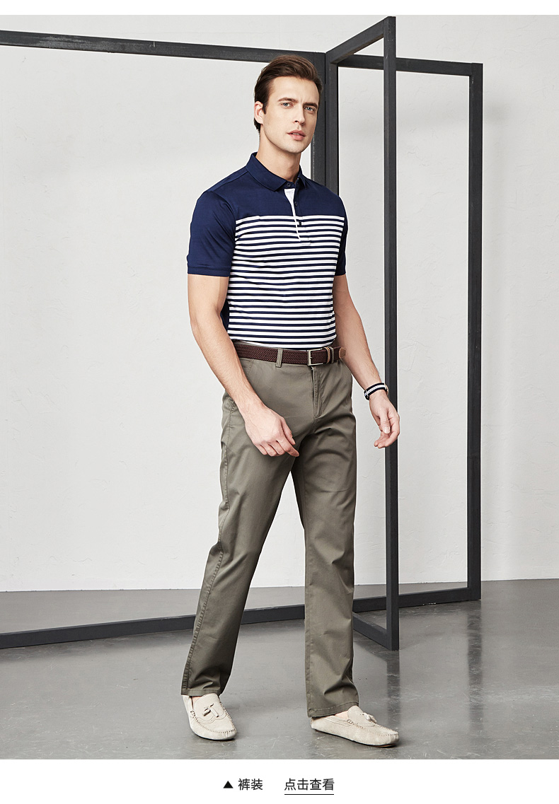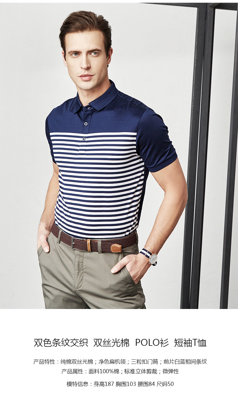 这款Virtue 富绅 男士经典条纹短袖Polo衫,采用100%纯棉双丝光棉面料,双色条纹交织,细致机理,透气排汗,净色扁机领,三粒扣门筒,前片白蓝相间条纹,标准立体剪裁,时尚百搭。