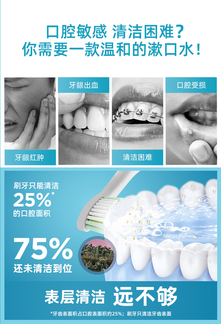 漱口水作为牙刷、牙线的辅助产品,漱口水起到了口腔保健的积极意义,特别是非处方的大厂漱口水。李施德林漱口水,可深入清洁口腔内部难刷部位,杀灭隐藏在牙缝间及刷牙后残留的细菌,比单靠刷牙更能有效减少牙垢膜及牙龈炎的形成。