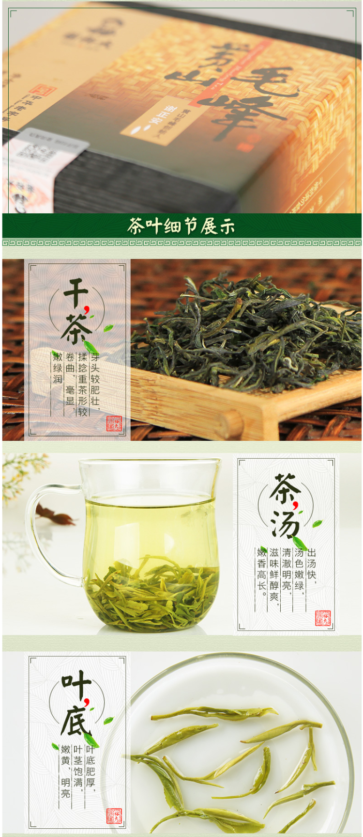 入杯冲泡雾气结顶,汤色清碧微黄,叶底黄绿有活力,滋味醇甘,香气如兰,韵味深长。由于新制茶叶白毫披身,芽尖峰芒,且鲜叶采自黄山高峰,遂将该茶取名为黄山毛峰。