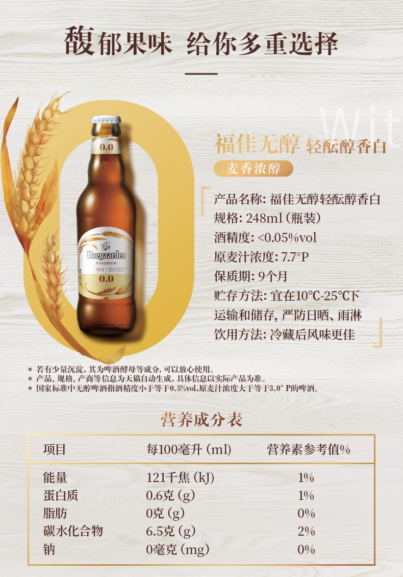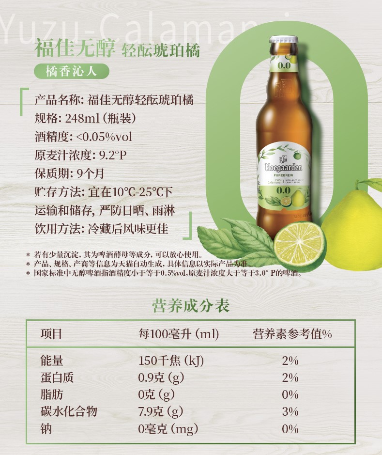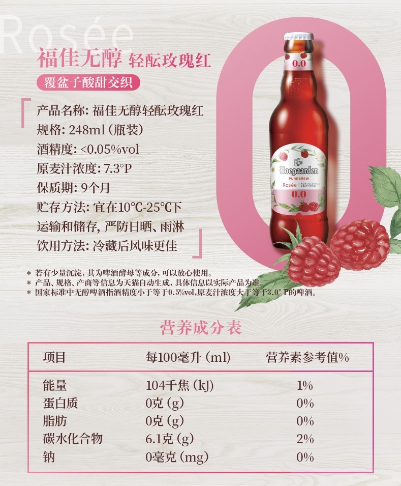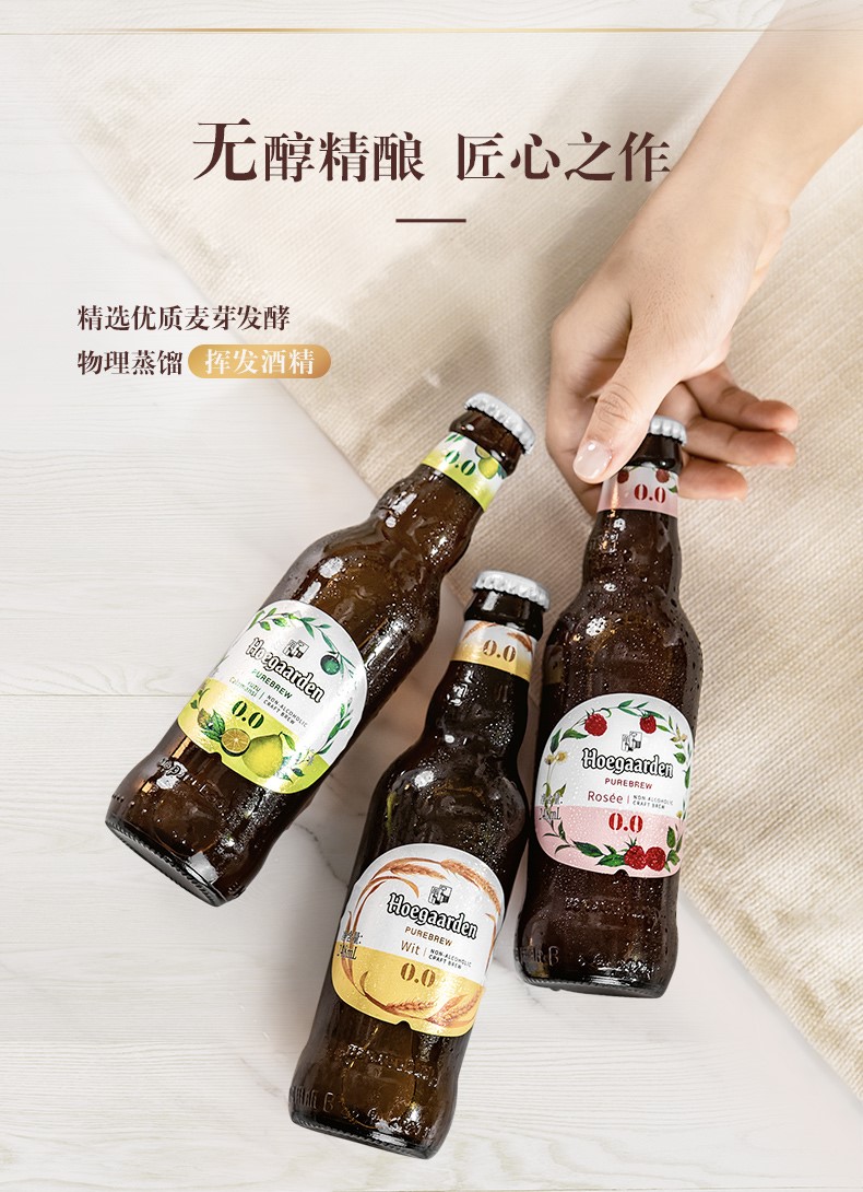 这款福佳Hoegaarden 无醇低度果味啤酒,精选优质麦芽发酵,物理蒸馏挥发酒精,酒精度<0.05%vol,果香浓郁,口感清爽,好喝不醉人。