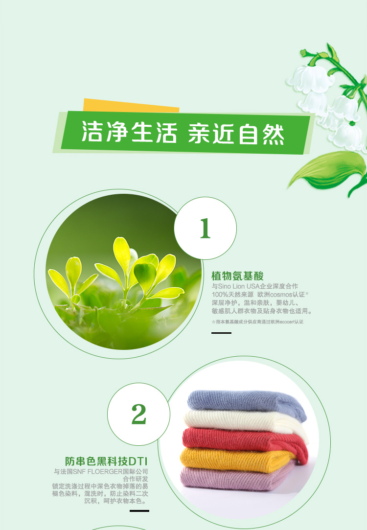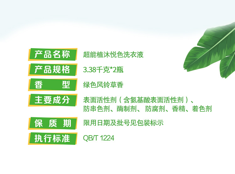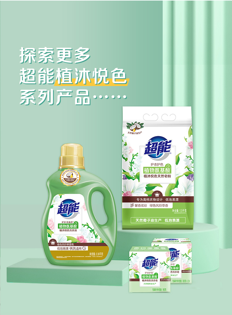 超能 植沐悦色洗衣液,甄选绿色原料,无磷配方,天然椰子油生产,安全无刺激,洗后衣服依旧可保持柔软蓬松,含氨基酸表面活性剂,护衣防串色,清新自然绿色风铃草香,清新柔美,体验大自然芬芳气息。