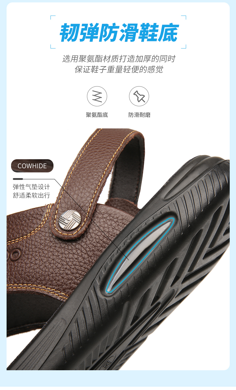 头层牛皮材质,气垫款式,弹性乳胶夹层,皮质柔软,防滑软底,凉拖两用。款2色可选,38~44码全。