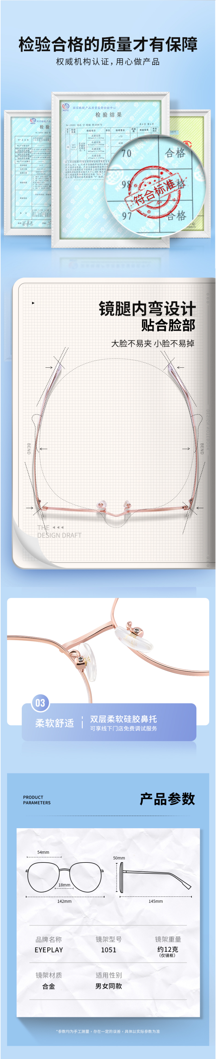 镜架有7°向内倾角,改变镜架在鼻梁上的重心点,防止眼镜框下滑。 弯折连接处开合自如不夹脸,软硅鼻托,减压无红印、支撑力度强。