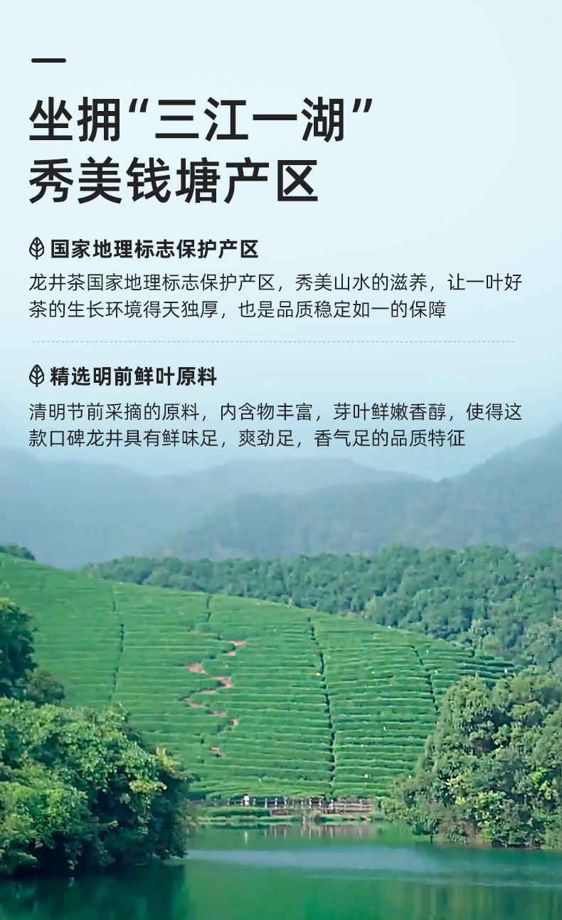 茶叶来自于龙井茶三大产区之一的钱塘产区,茶区位于钱塘江、富春江,新安江与千岛湖的美丽山水间。