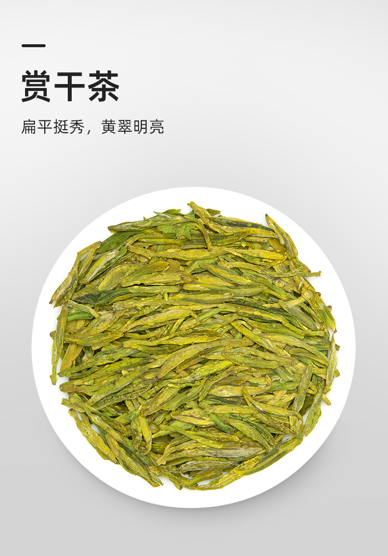 经炒制后的干茶,扁平光滑,仍见锋毫,色泽绿中显黄;茶汤碧翠清澈,清香浓郁,温润回甘,叶底舒展,油润鲜活。