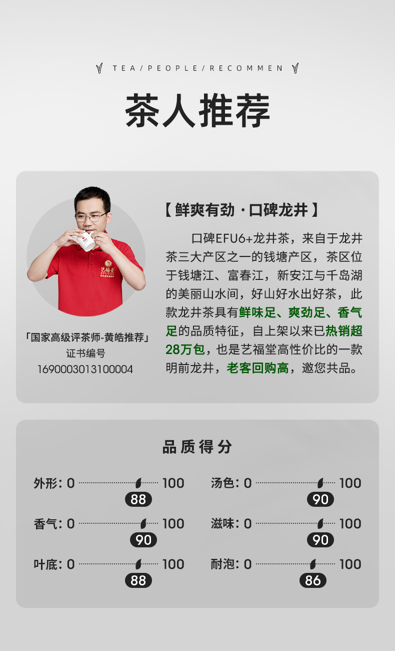 艺福堂主打西湖龙井,是中国茶行业为数不多的年销售额过3亿的品牌之一 ,也是国家高新技术企业、中国茶叶行业综合实力百强企业、 CCTV中国品牌榜入围品牌、全球十佳网商、互联网茶叶领导品牌、杭州市农业龙头企业、杭州市十大产业重点企业、杭州市著名商标、杭州市准独角兽企业。