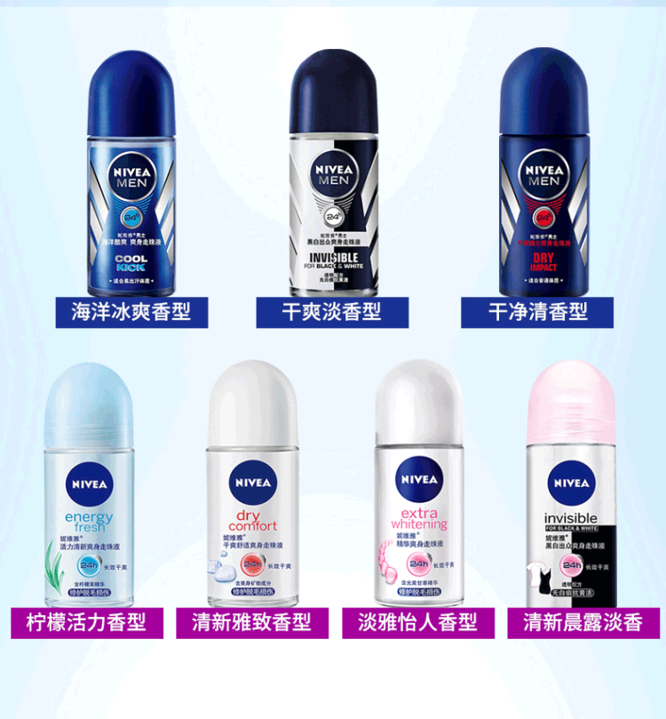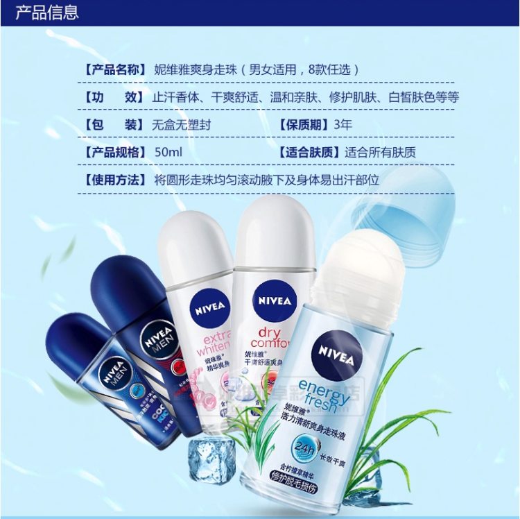 这款妮维雅 爽身走珠液,止汗香体,干爽舒适,温和亲肤,修护肌肤,白皙肤色,规格是50ml。