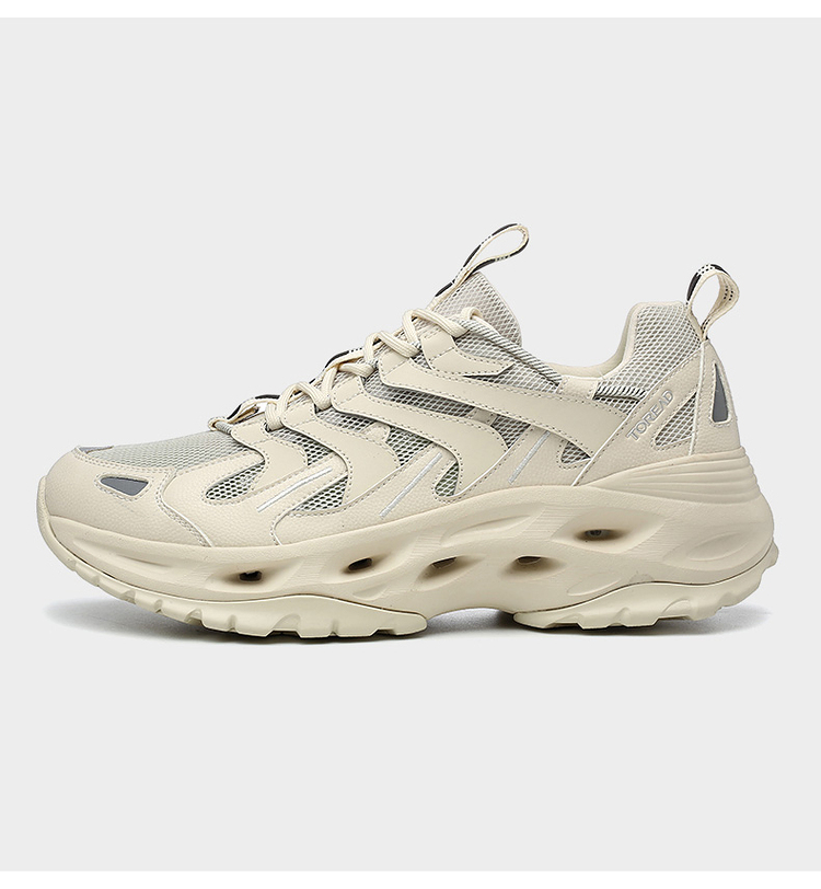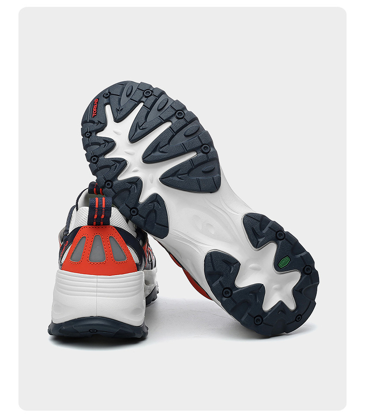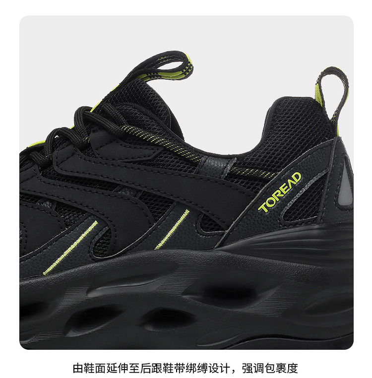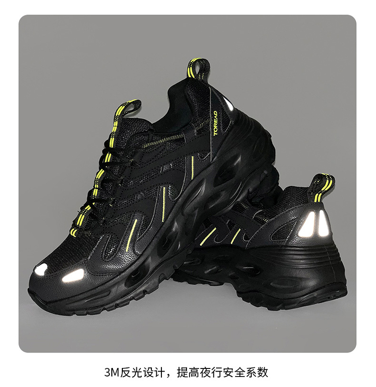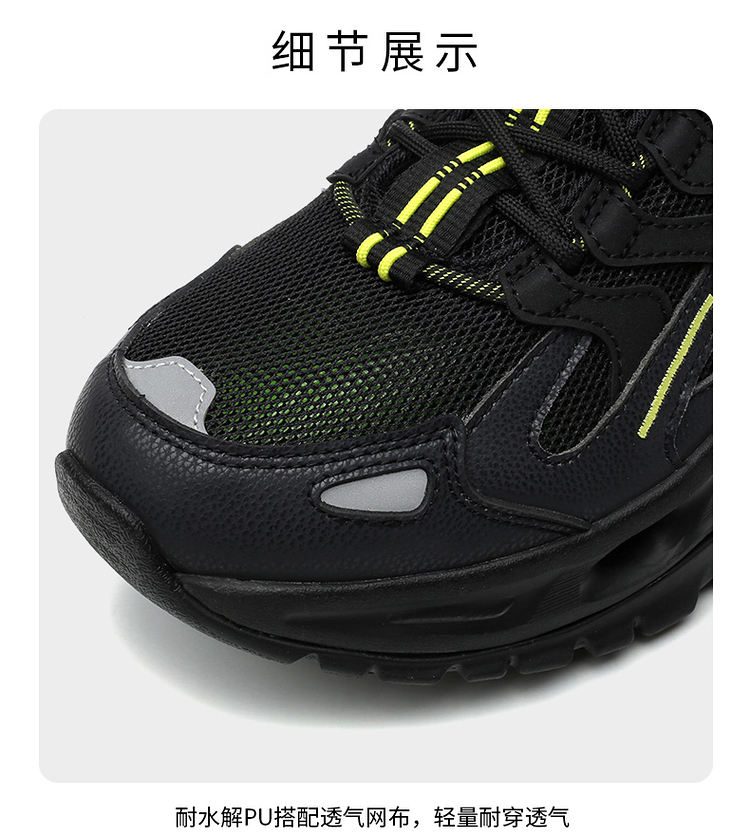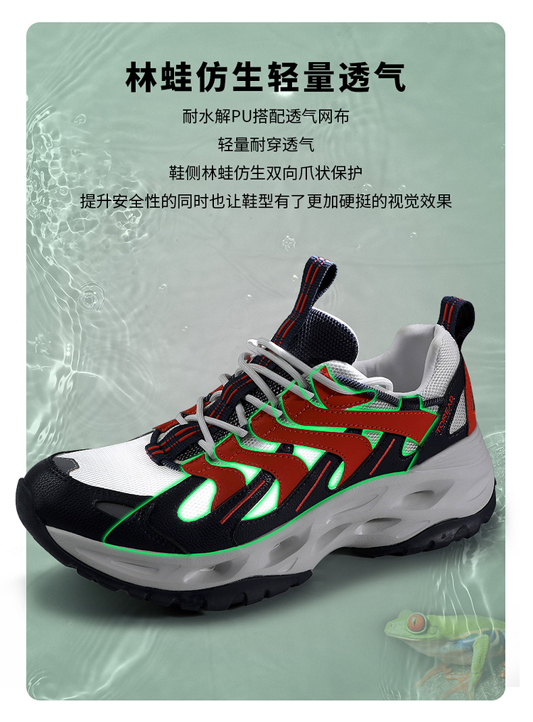 耐水解PU搭配透气网布,轻量耐穿透气。鞋侧是林蛙仿生双向爪状保护,提升安全性的同时也让鞋型有了更加硬挺的视觉效果。