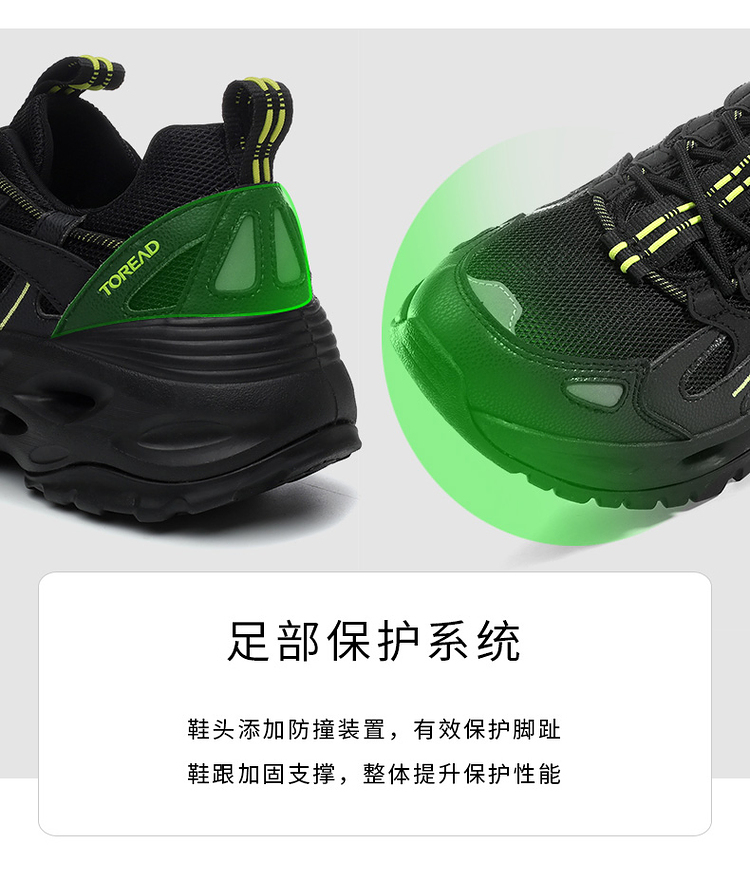 鞋头添加防撞装置,有效保护脚趾,鞋跟加固支撑,整体提升保护性能。
