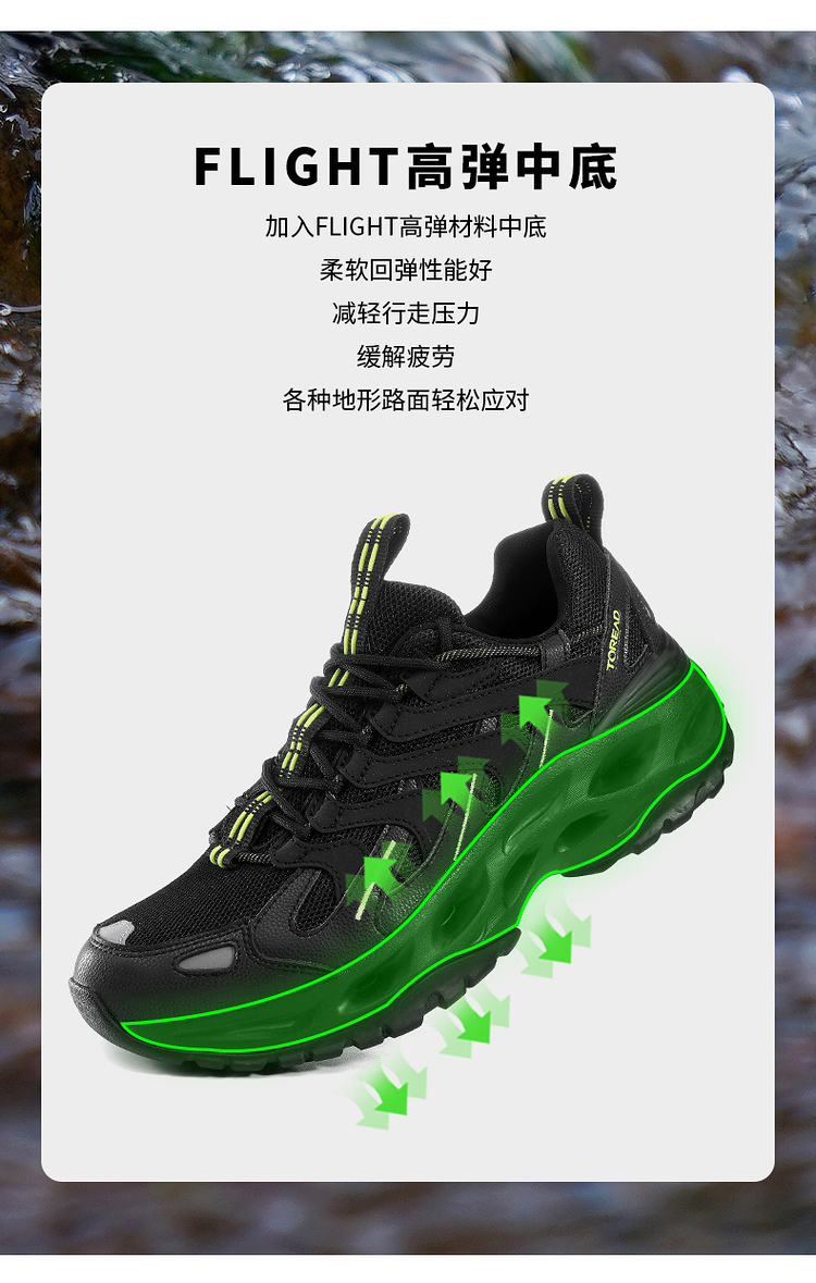 加入FLIGHT高弹材料的中底,柔软回弹性能好,能减轻行走压力、缓解疲劳,各种地形路面轻松应对。
