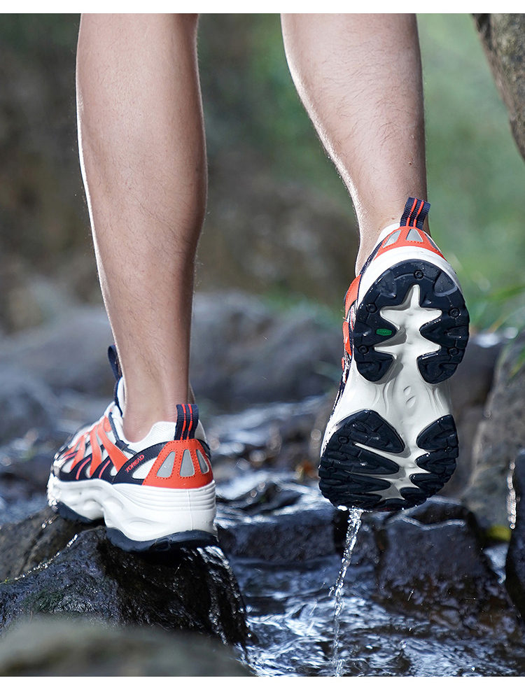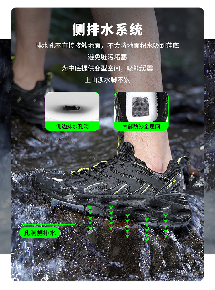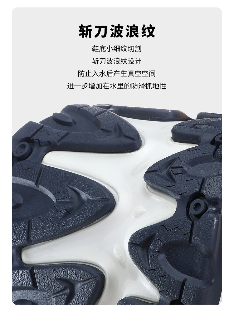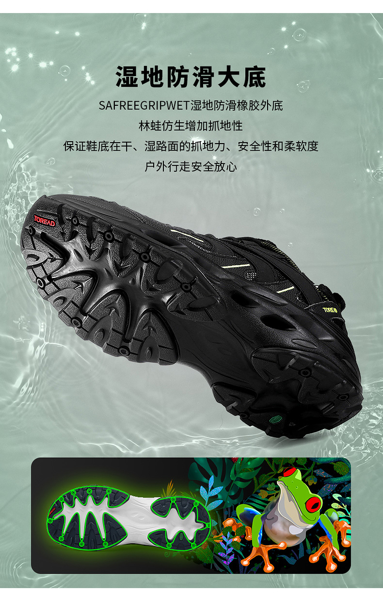鞋底使用SAFreeGripwet湿地防滑配方橡胶,不惧湿滑山路地形,抓地力强悍。外层鞋底是斩刀波浪纹,小细纹切割的鞋底,能防止入水后产生真空空间,进一步增强在水里的防滑抓地性。