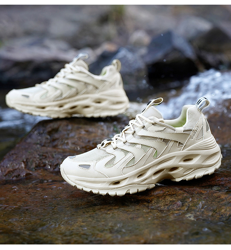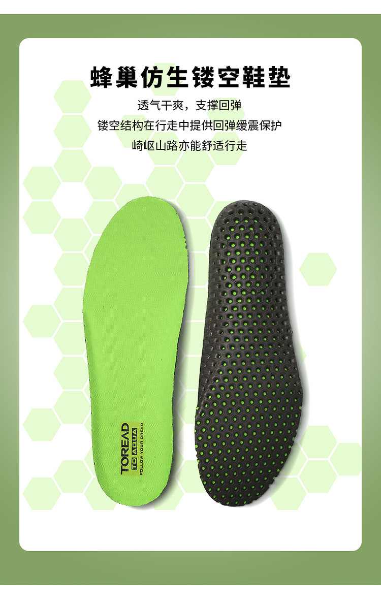 蜂巢仿生镂空鞋垫,透气干爽、支撑回弹,镂空结构在行走中提供回弹缓震保护。涉水后也能加快足底水分蒸发、提升舒适度。