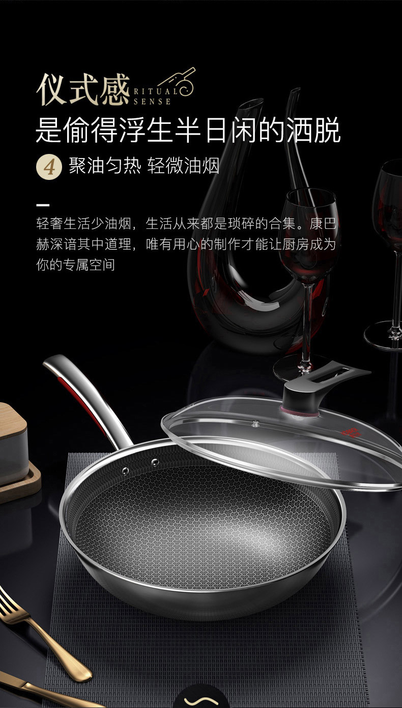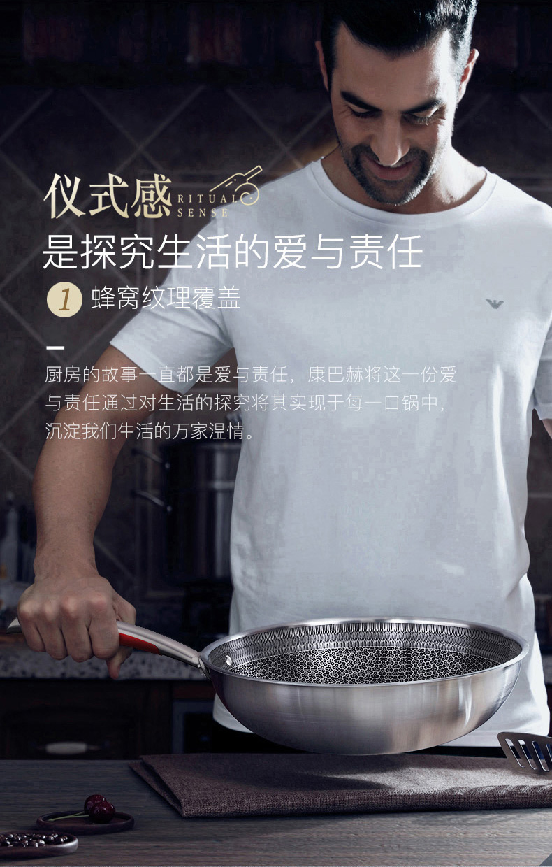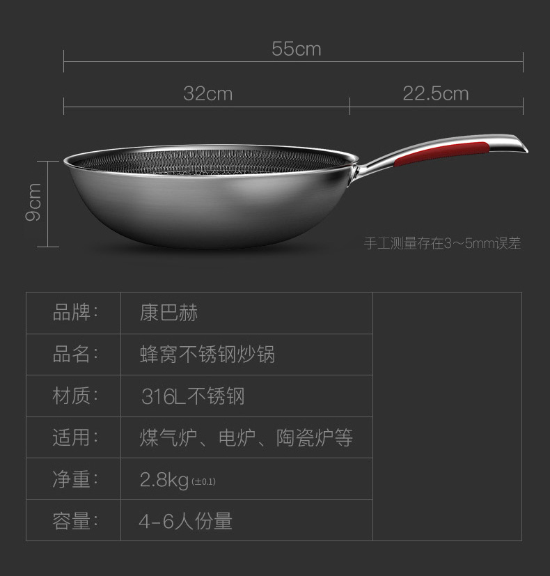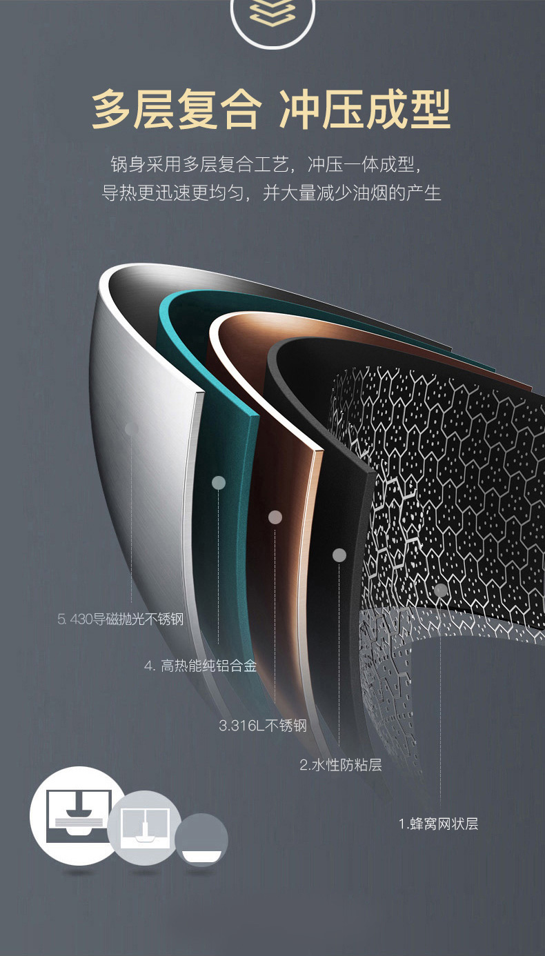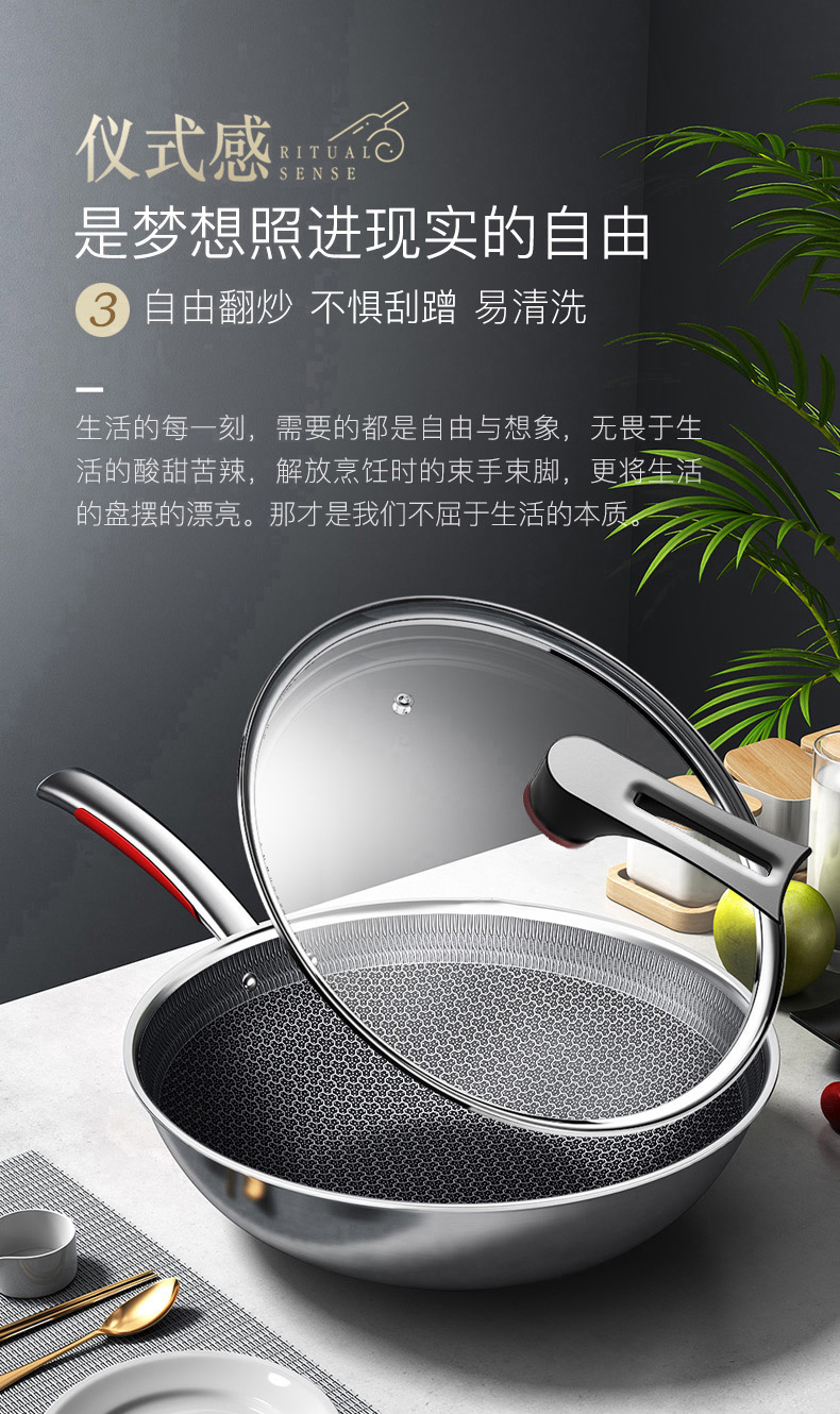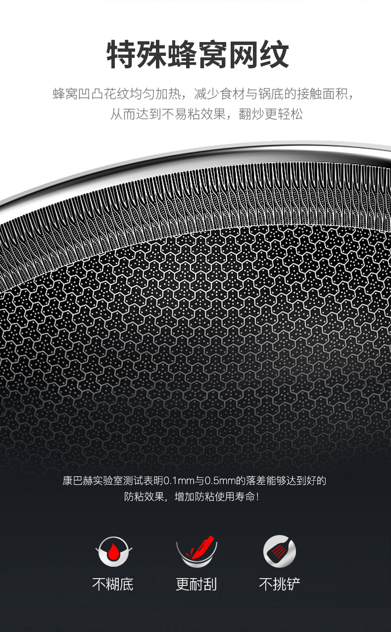 炒锅采用德国蜂巢浮雕技术,减少食物与锅面的接触面积,形成气体悬浮,达到物理不粘的效果;锅身采用多层复合工艺,冲压一体成型,导热迅速均匀,加热锅底不易变形,并快速将热能传递到锅身,节能省油;健康、安全,直径32cm,足够3口之家使用。