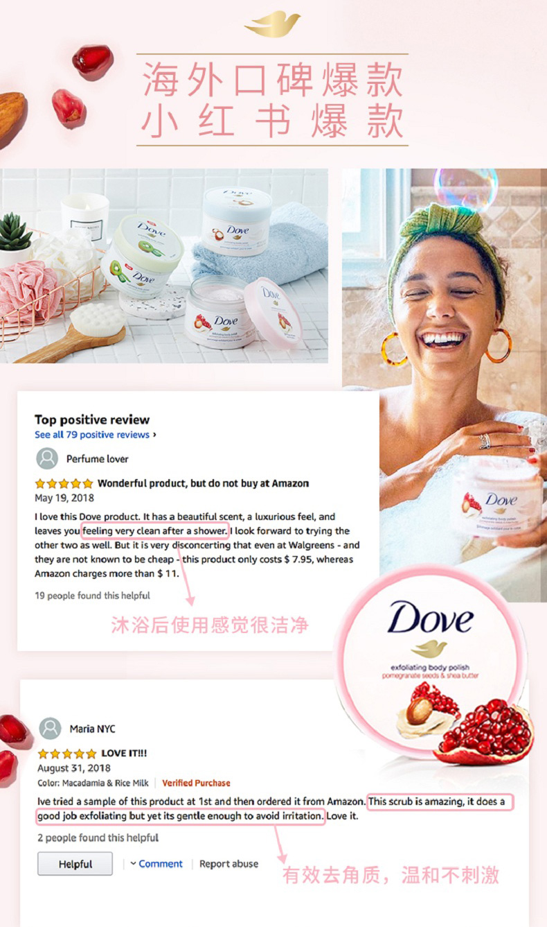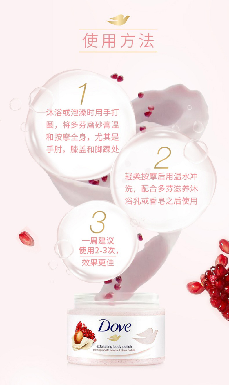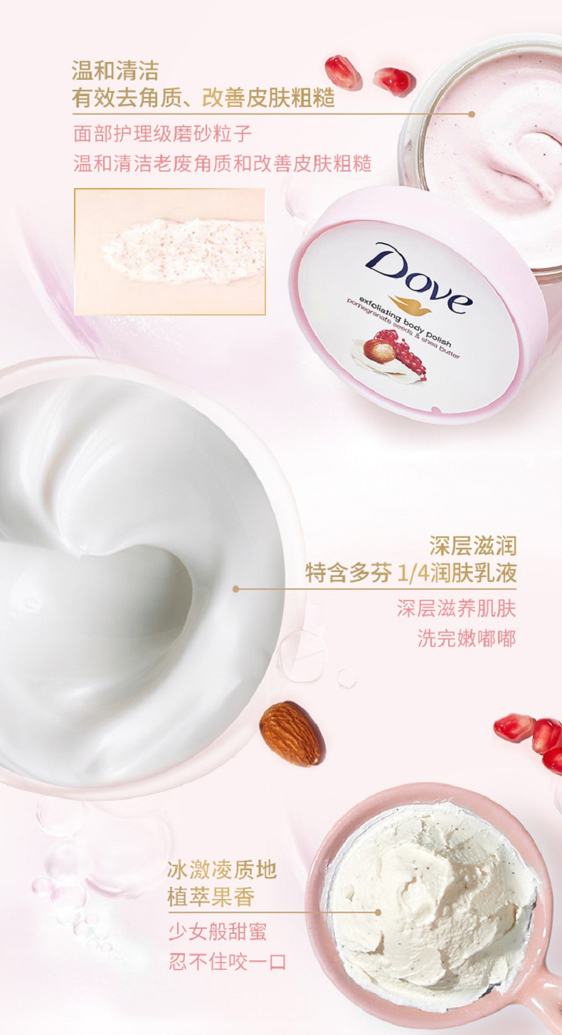 这款多芬 石榴籽滋润乳,冰激凌质地+植萃果香,针对皮肤粗糙、后背痘、黑关节、橘皮纹,含面部护理级磨砂粒子,能温和清洁老废角质和改善皮肤粗糙;特含四分之一的润肤乳液,能深层滋养肌肤,易涂抹易冲洗。