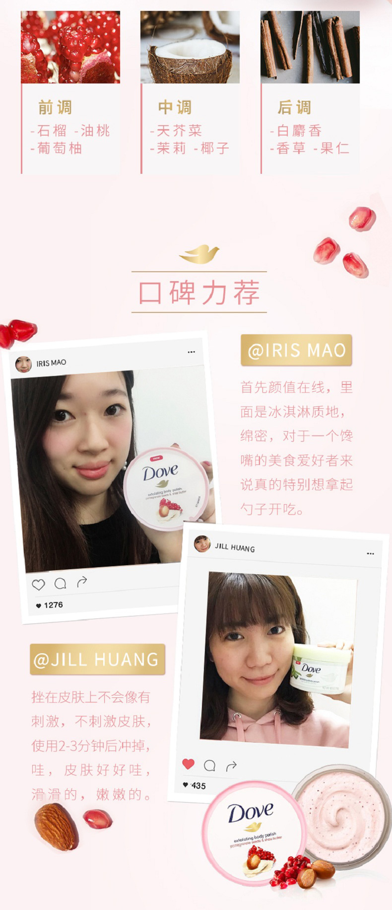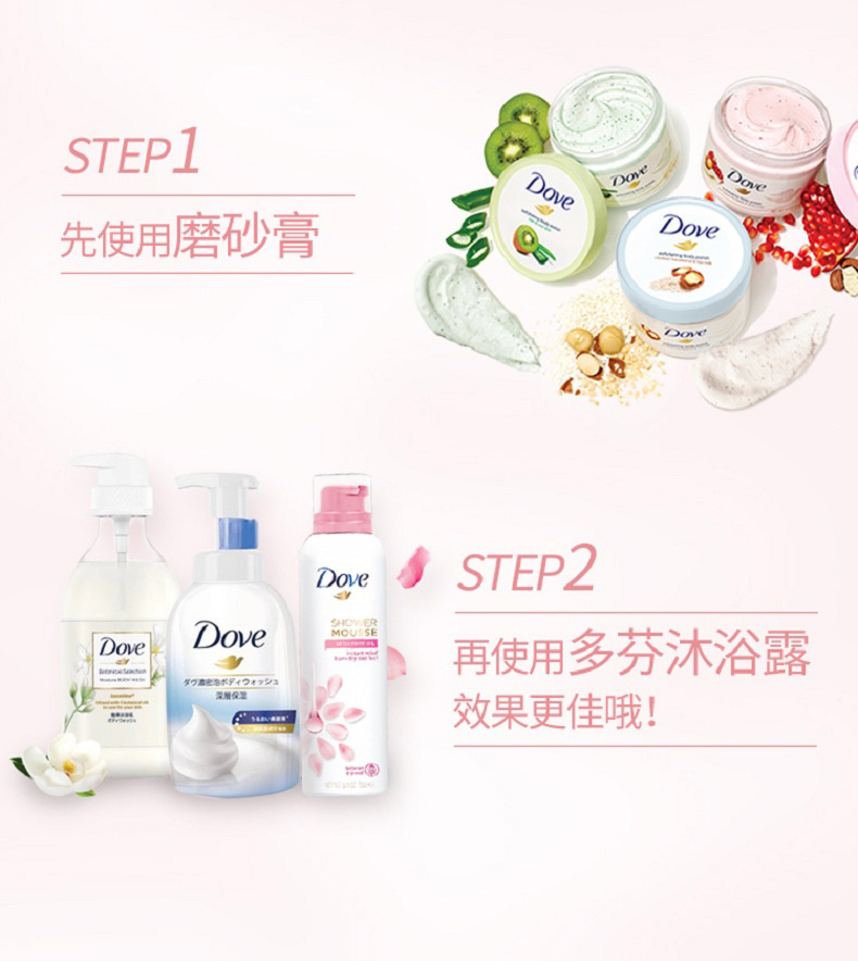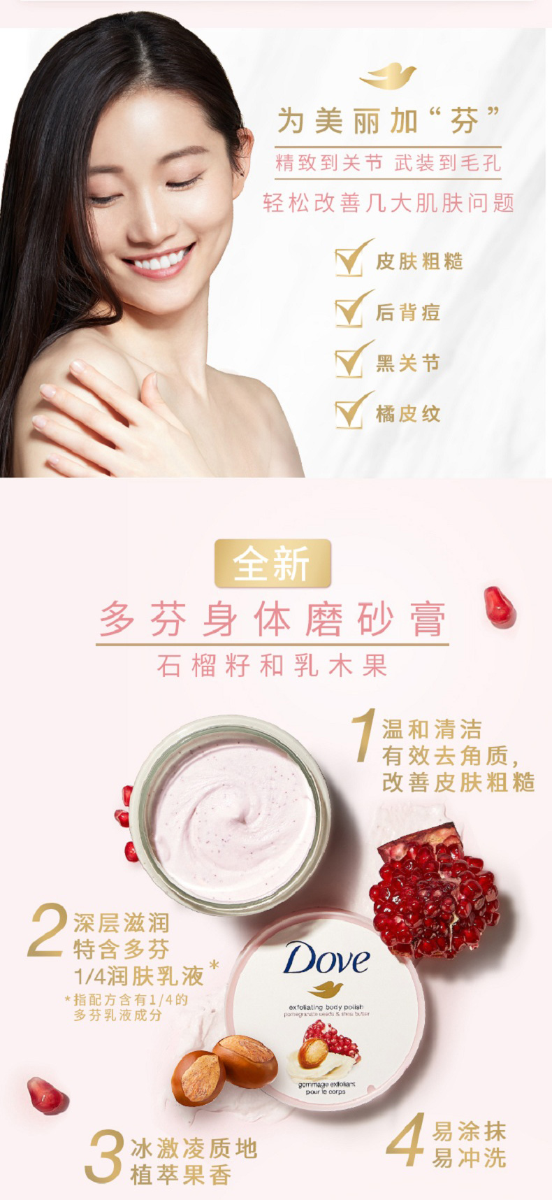 这款多芬 石榴籽滋润乳,冰激凌质地+植萃果香,针对皮肤粗糙、后背痘、黑关节、橘皮纹,含面部护理级磨砂粒子,能温和清洁老废角质和改善皮肤粗糙;特含四分之一的润肤乳液,能深层滋养肌肤,易涂抹易冲洗。