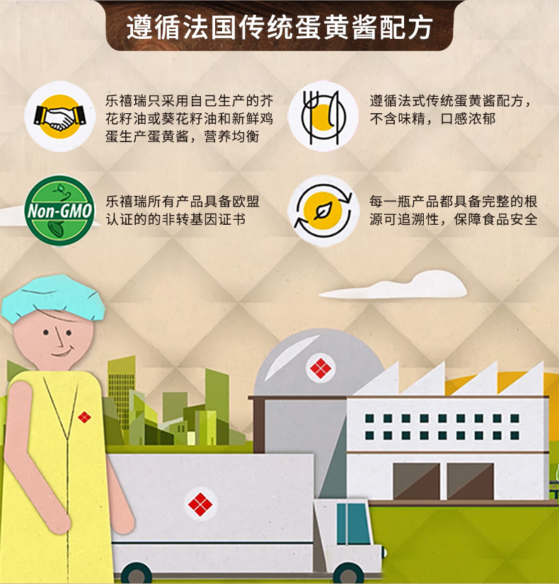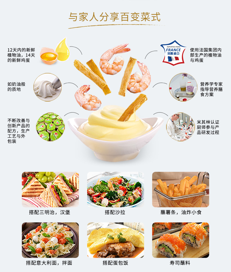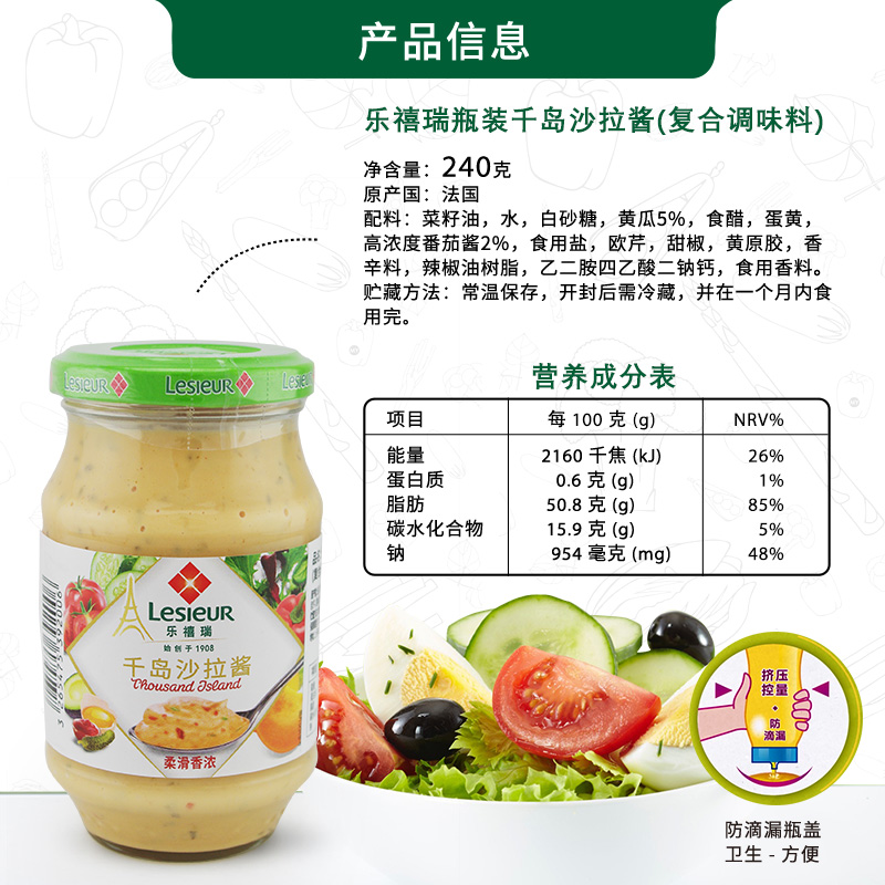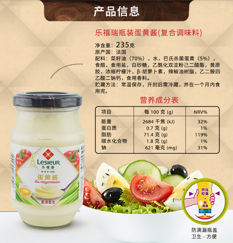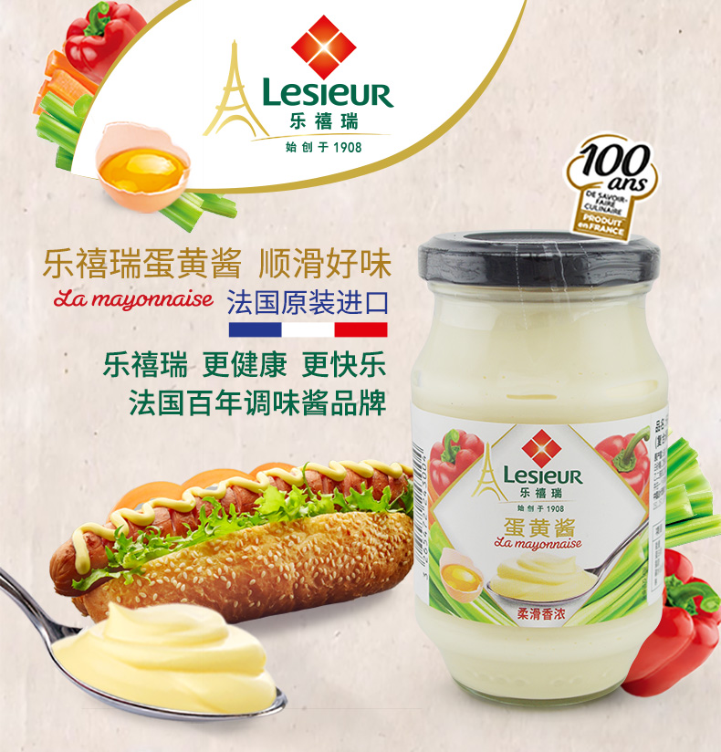 这款乐禧瑞Lesieur蛋黄酱,法国进口,严选新鲜鸡蛋、新鲜植物油,如奶油般的质地,口感浓郁香醇,欧盟认证,非转基因,可搭配三明治汉堡、沙拉,薯条,拌面等。