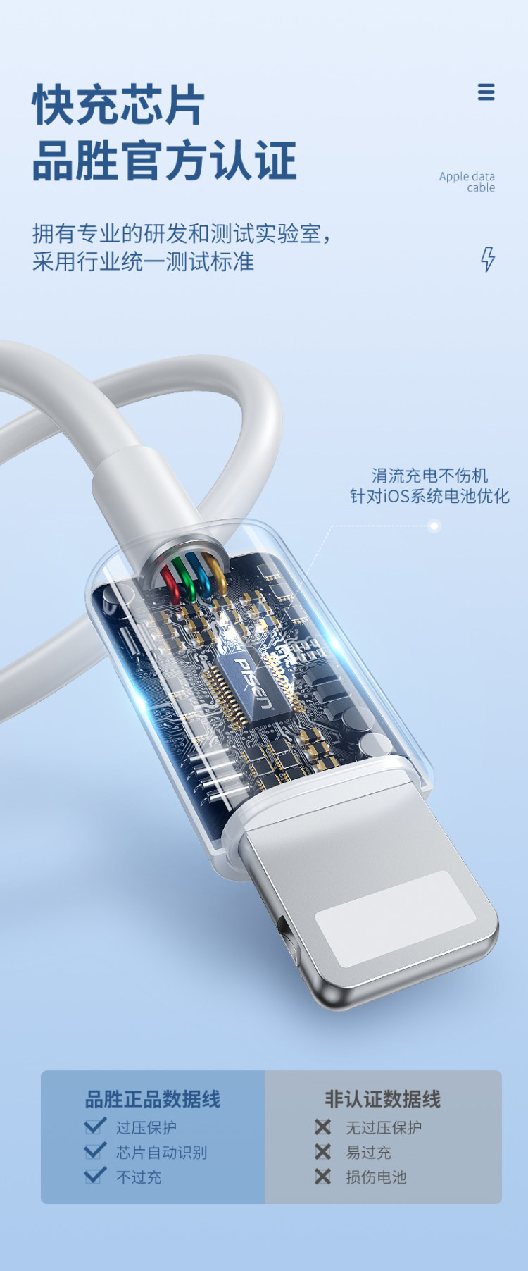 这款品胜 iPhone Lighting数据线,在最容易坏的线头和线身位置做了加固处理,不易发生断裂。PVC加粗线身,强韧抗拉防拽,防止缠绕;