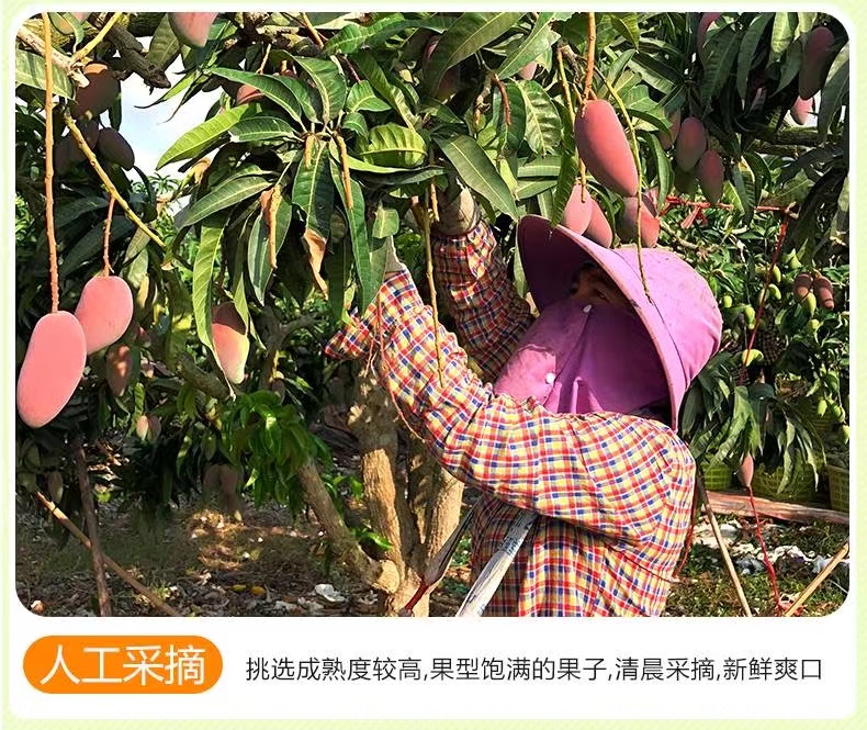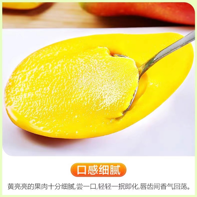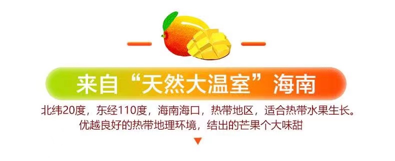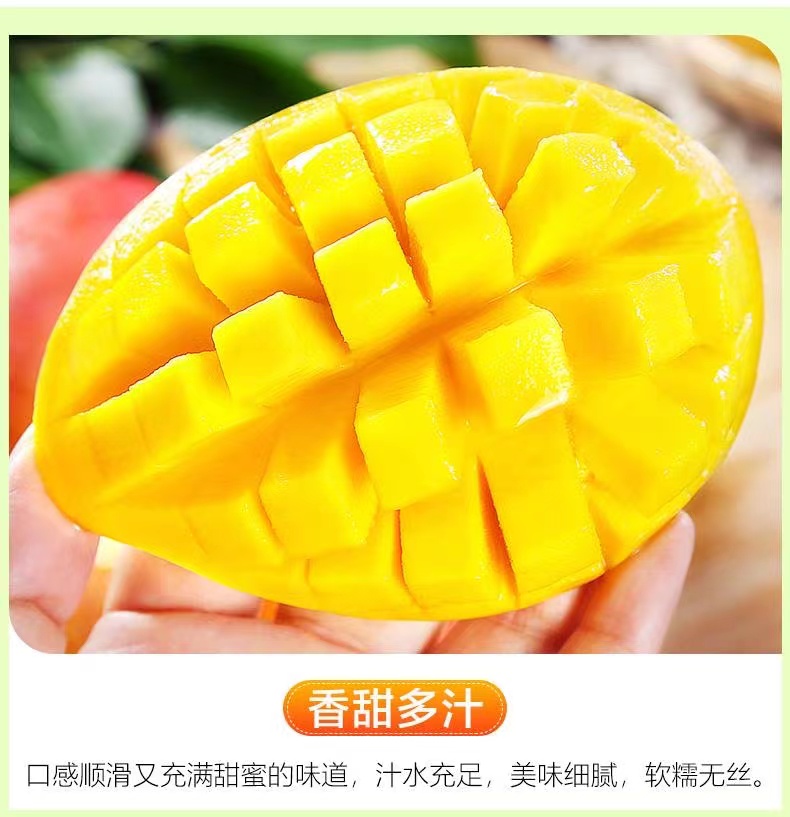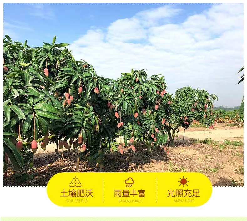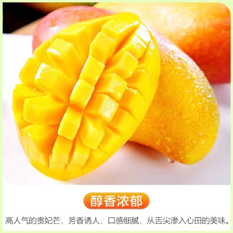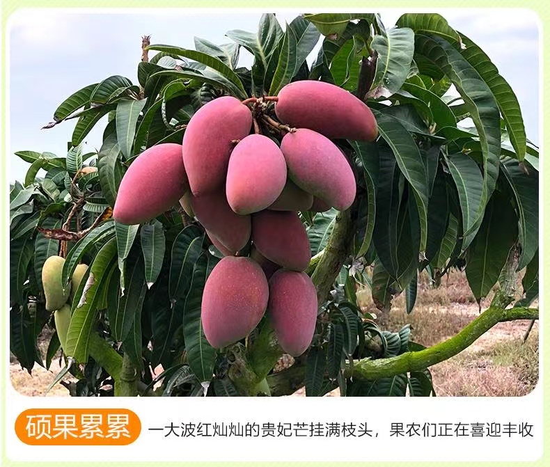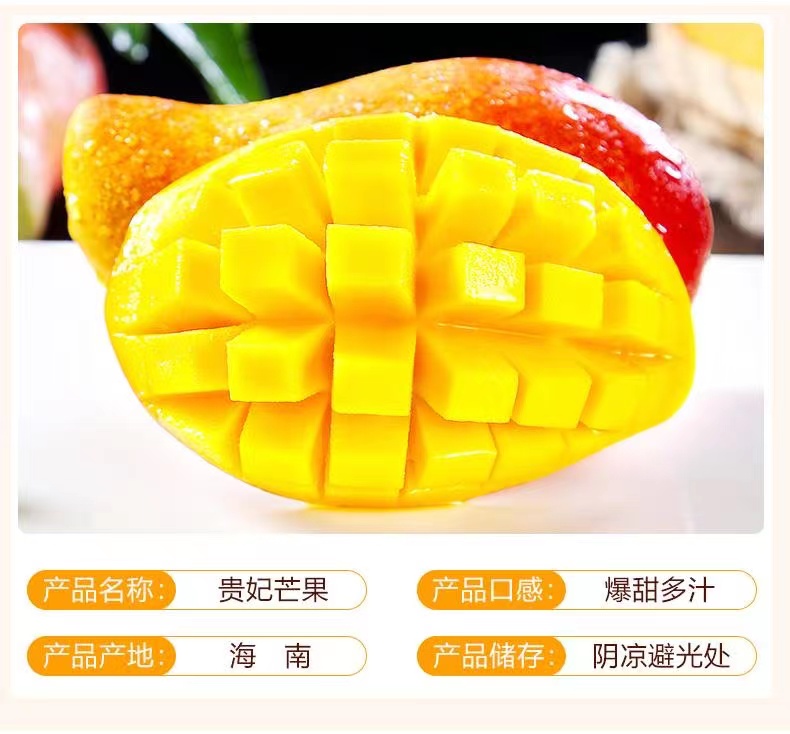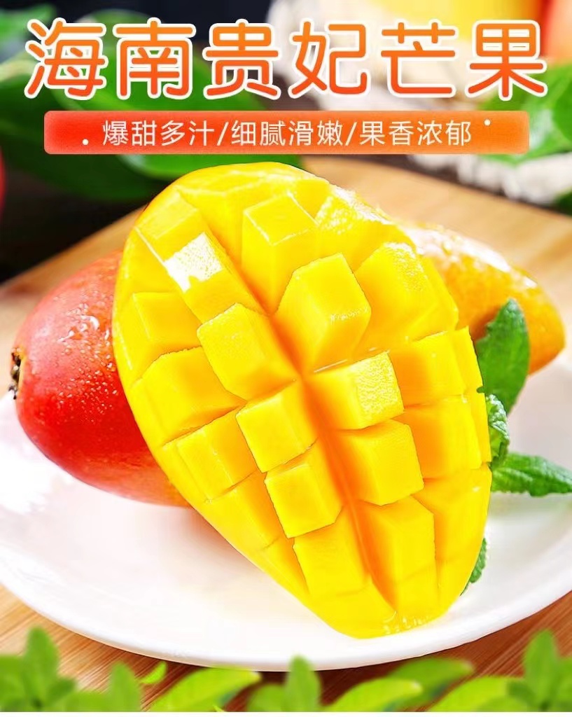 海南贵妃芒果,其外表美艳无比,果皮青里透红,成熟时呈黄色带彩色,无任何斑点,核小无纤维,水分充足,被人们称赞其品味俱佳。