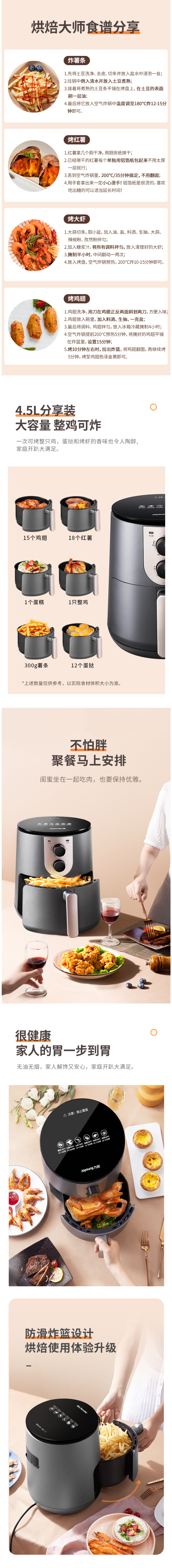 这款九阳KL45-VF510空气炸锅,4.5L大容量,抽桶即断电,可以随时添料尝味或放入食物续炸。双旋钮操作,分别控制时间(0~30分钟)、温度(80~200℃)。