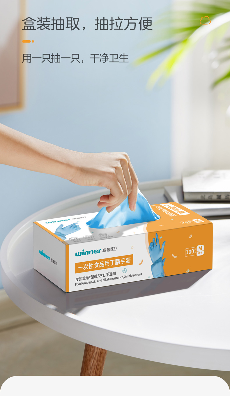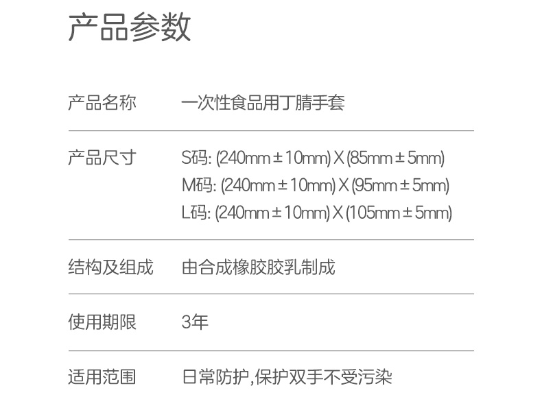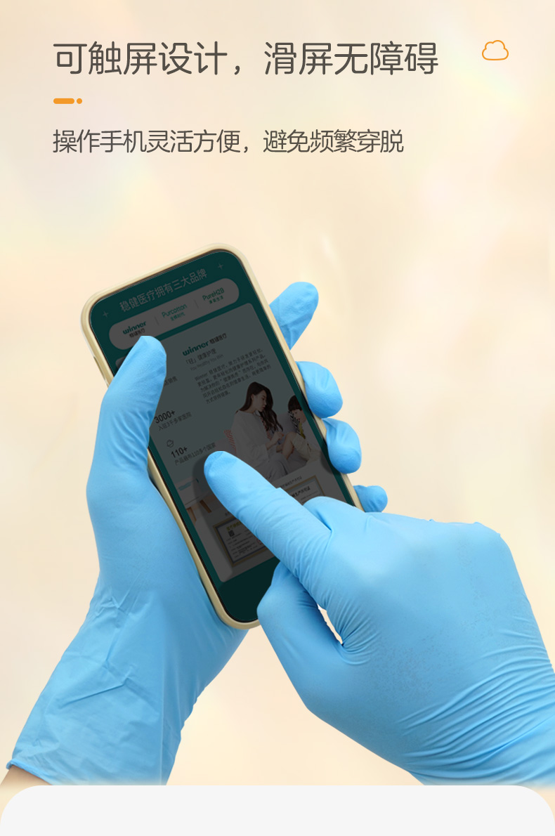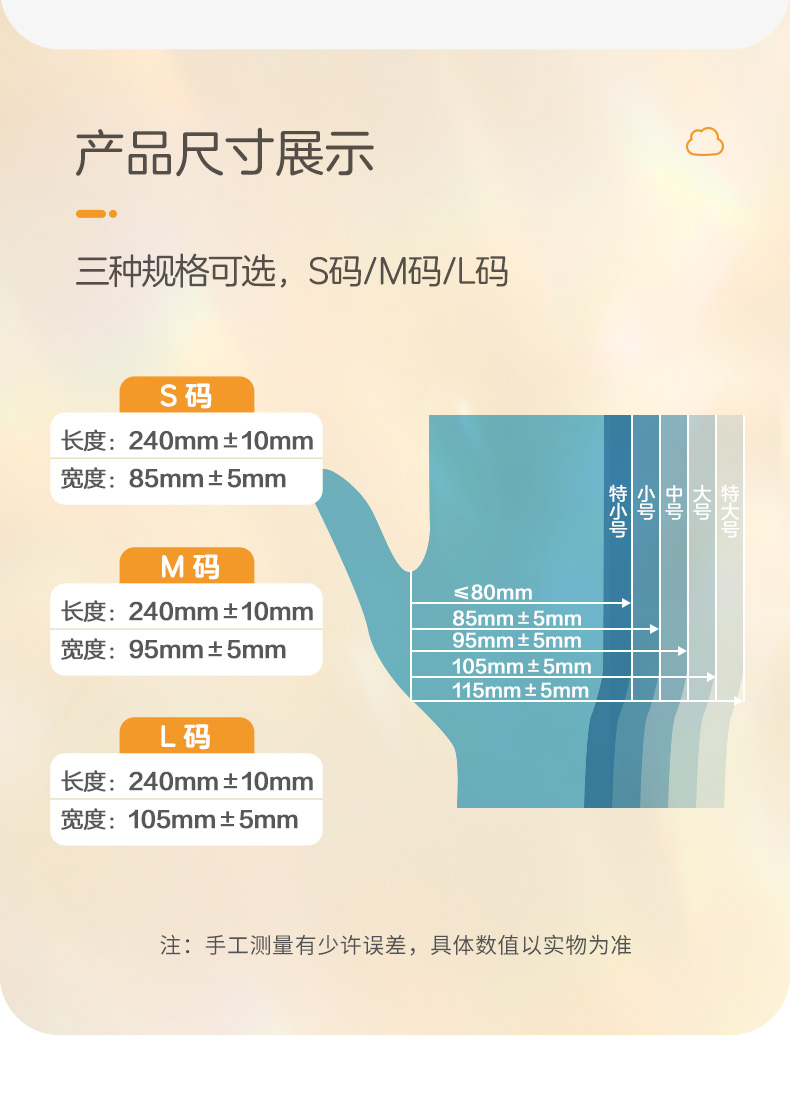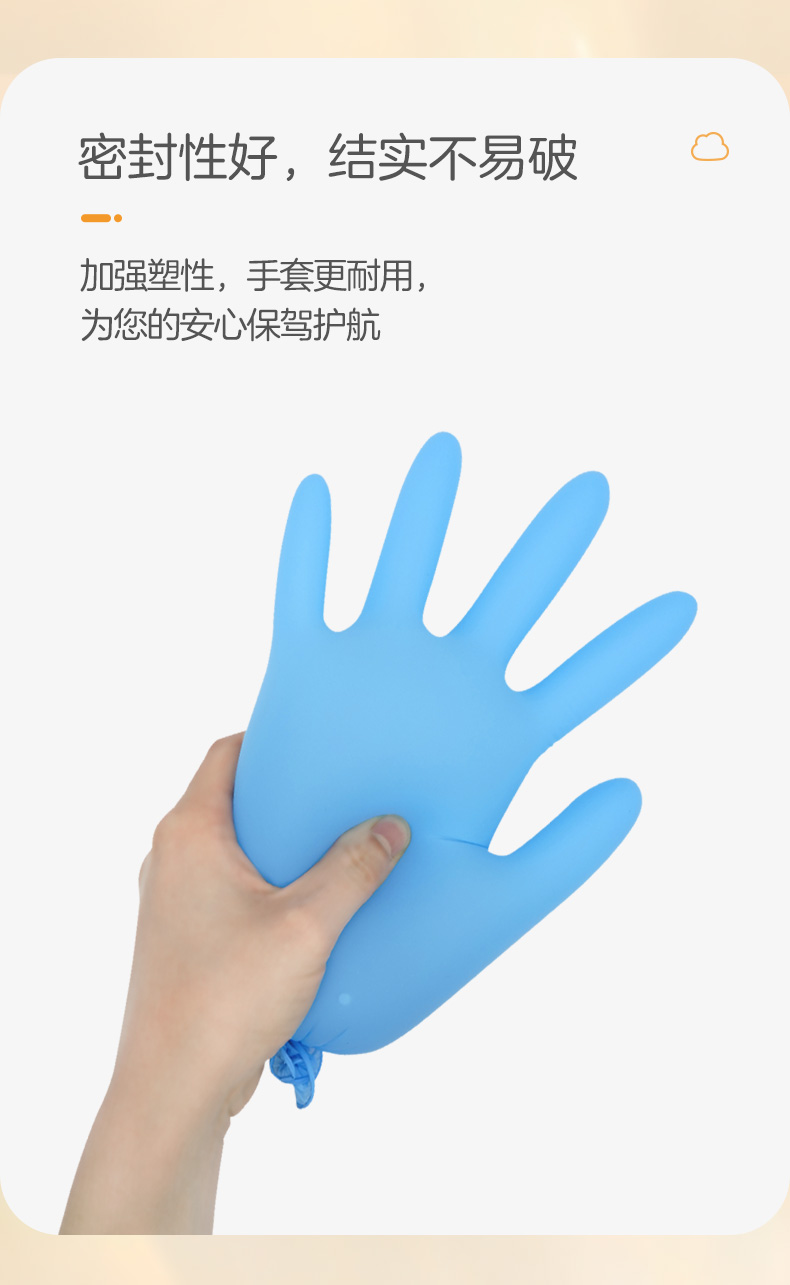 S/M/L三种尺码可选,左右手通用,一次性丁腈乳胶手套,密封性好,无渗漏,有效隔离细菌病毒,高弹强韧,耐穿刺不易破,防止交叉感染,防疫必备一次性手套,呵护全家!共抗疫情!