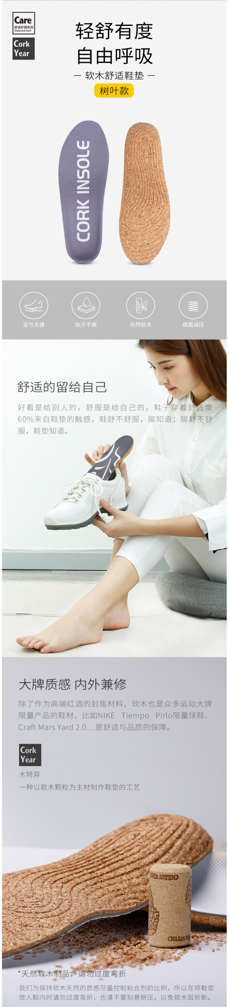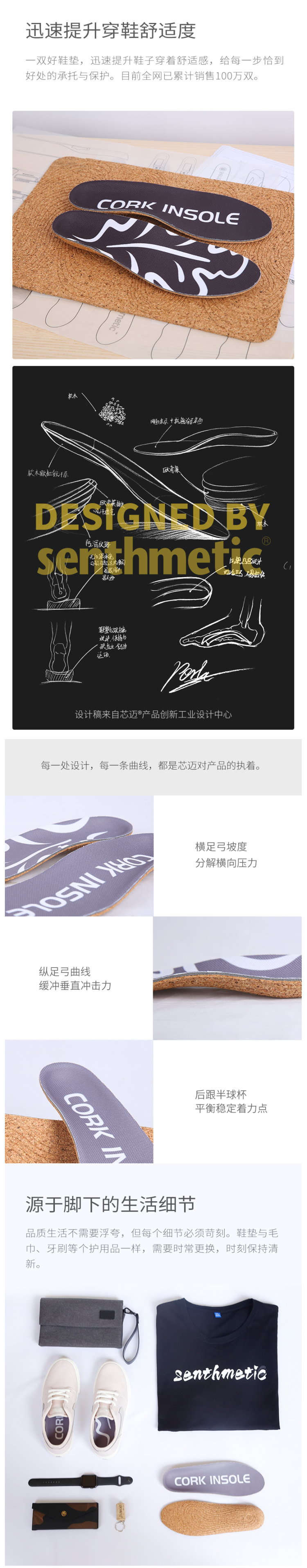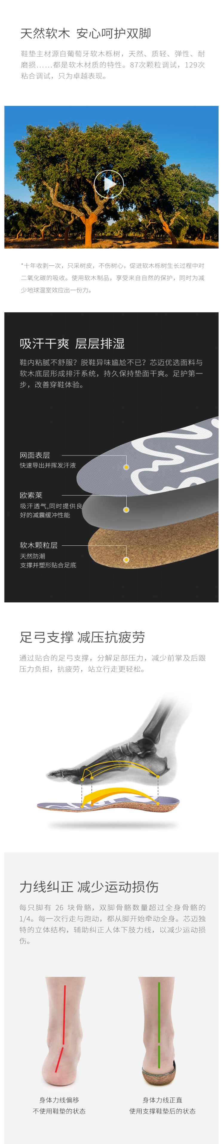 设计上面也用足了心思,芯迈的专利科技 微塑形 ,在使用鞋垫3天后,自动将鞋垫调试到最贴合你的高度,提供最合适你的支撑力度;独特的承托设计,有助于分散足部压力,走路多了不容易累脚;同时由于软木天生的大孔隙度,吸湿排汗性天生更胜一筹,所以不容易臭脚。