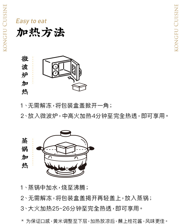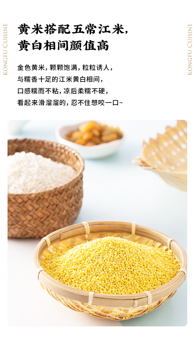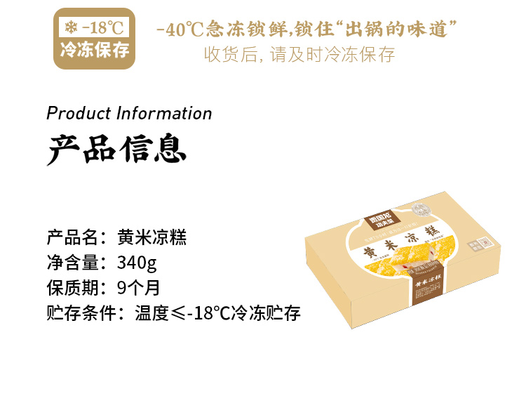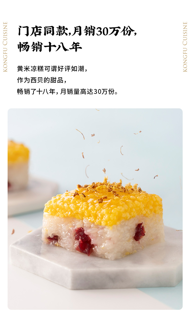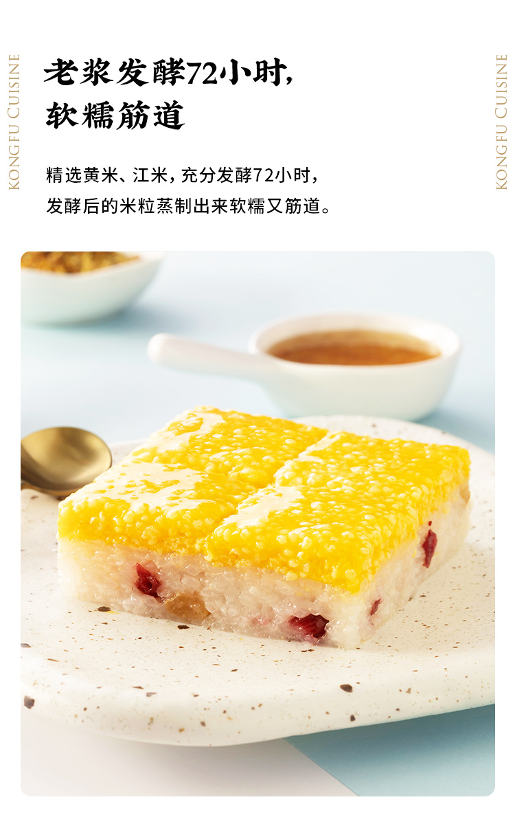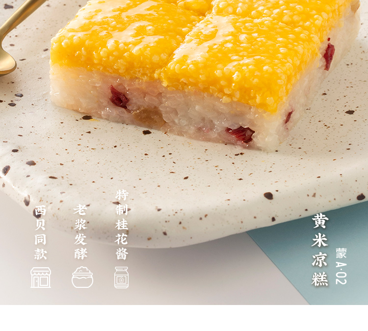 精选黄米、江米,充分发酵72小时,发酵后的米粒蒸制出来软糯又筋道,凉后柔糯不硬,口感香滑,将传统红枣升级为蔓越莓干与葡萄干红绿搭配,清新自然,软糯筋道的凉糕之中进发出丝丝酸爽,在蘸上特制桂花酱,满口花香甜而不腻。