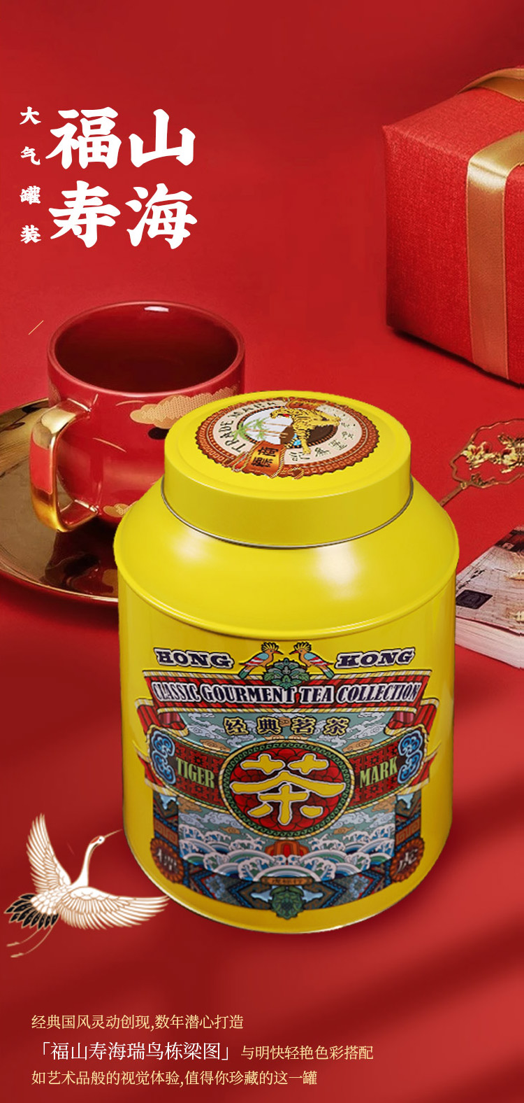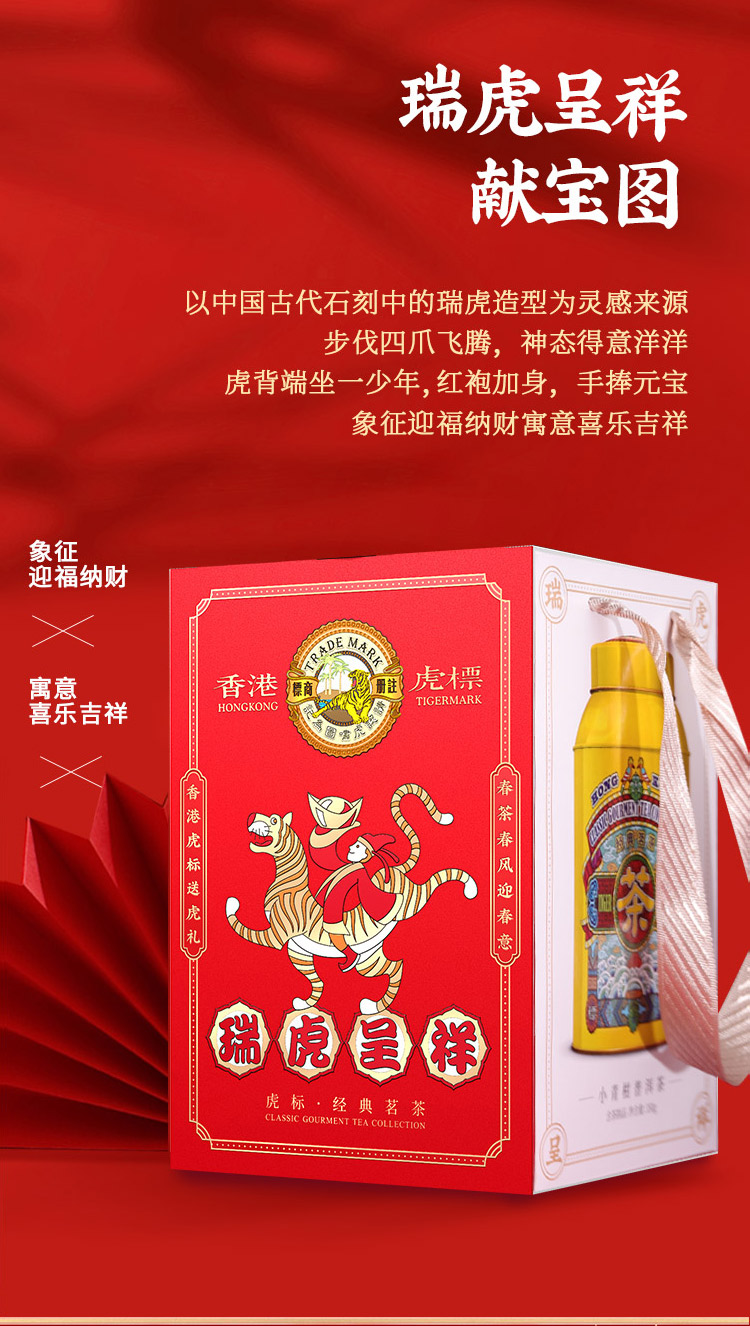 这款虎标 新会小青柑普洱熟茶 ,以中国古代石刻中的瑞虎造型为灵感来源,步伐四爪飞腾,神态得意洋洋,虎背端坐一少年,红袍加身,手捧元宝,象征迎福纳财寓意喜乐吉祥。经典国风灵动创现,数年潜心打造,「福山寿海瑞乌栋梁图」与明快轻艳 色彩搭配,如艺术品般的视觉体验,值得你珍藏的这一罐。来自新会的小青柑与云南普洱的天然结合,普洱条索粗壮紧结,果型完整饱满;茶汤柑香扑鼻,细腻绵滑,回甘生津;茶底肥厚,油亮鲜活,果胶丰富,底香悠长。