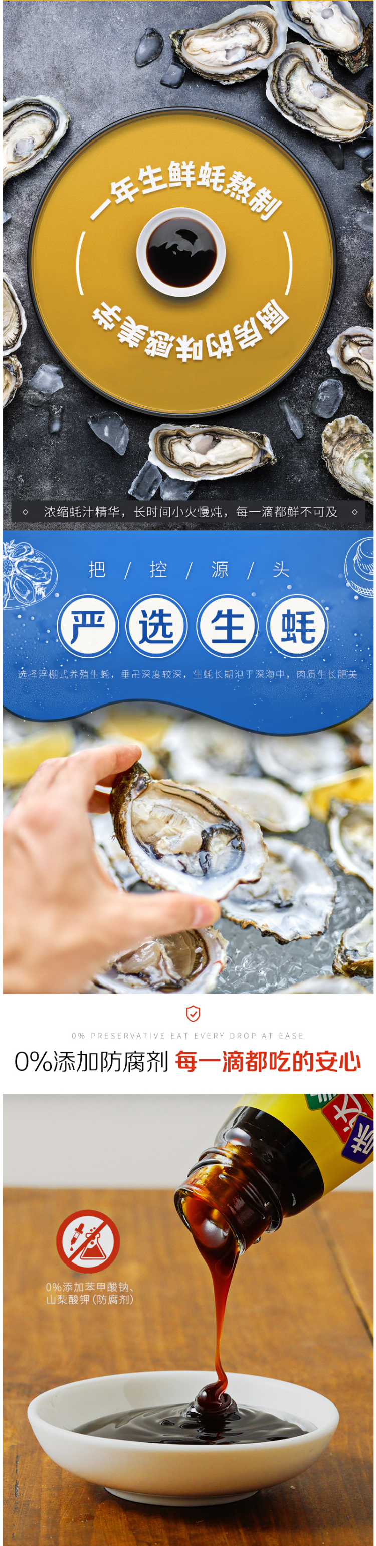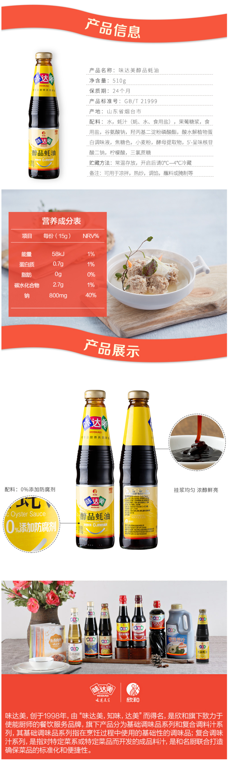 这款欣和 味达美醇品蚝油,选择优质生蚝长时间小火慢炖熬制而成,色泽浓郁,浓稠度合适,挂浆均匀,提鲜出色,0添加防腐剂。