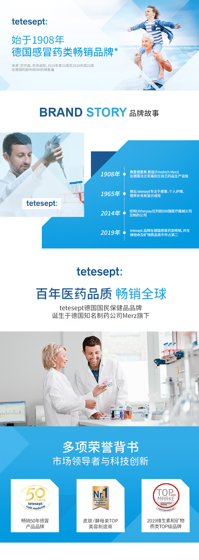 Merz诞生于1908年,Merz集团作为源自德国制药公司,已拥有百年以上历史。凭借其强大的研发能力和创新理念,其各类产品一直在德国市场中处于领导地位。旗下的tetesept品牌创立于1965年,经过数十年的不断创新发展,在感冒药、保健品,以及自我医疗方面长期处于领先地位,线下零售店1万多家大中型药店超市在售。