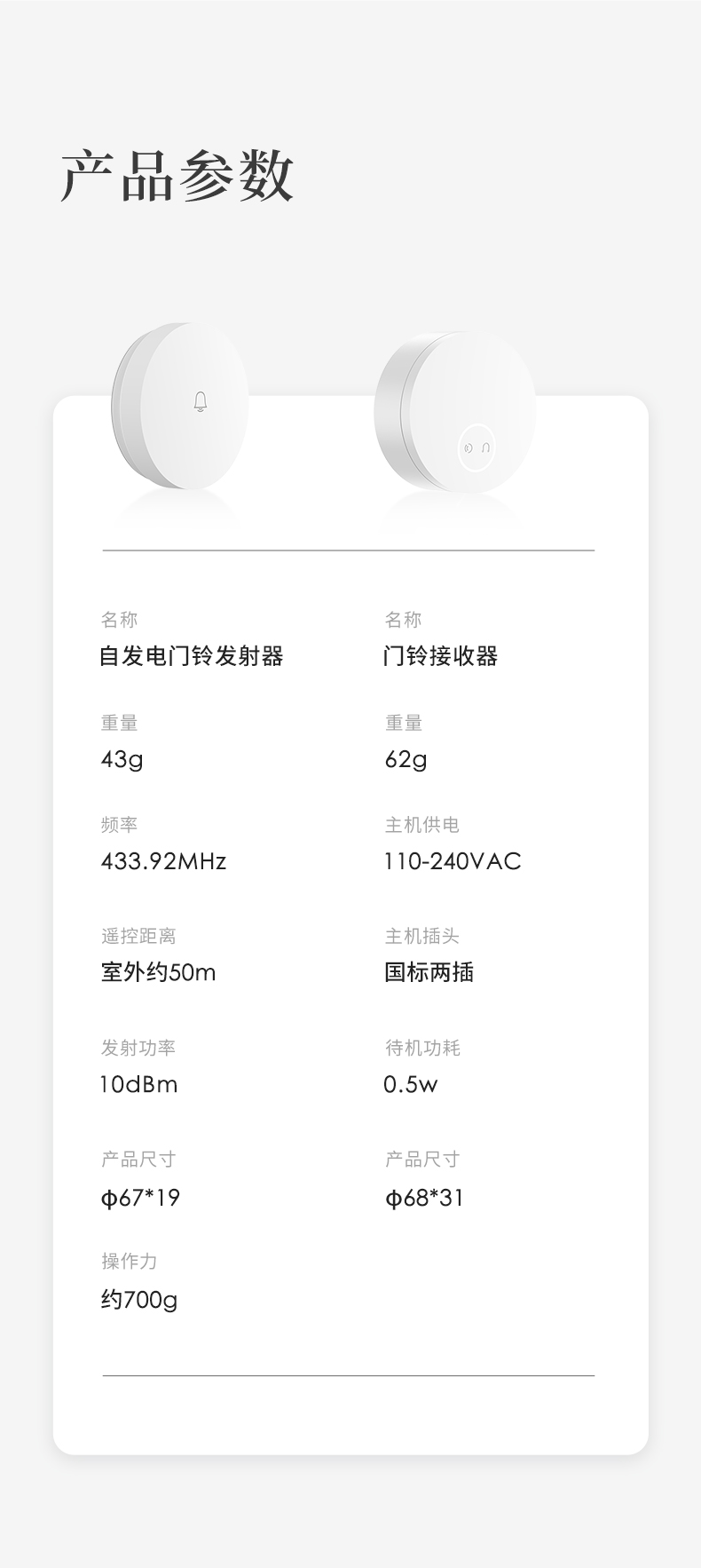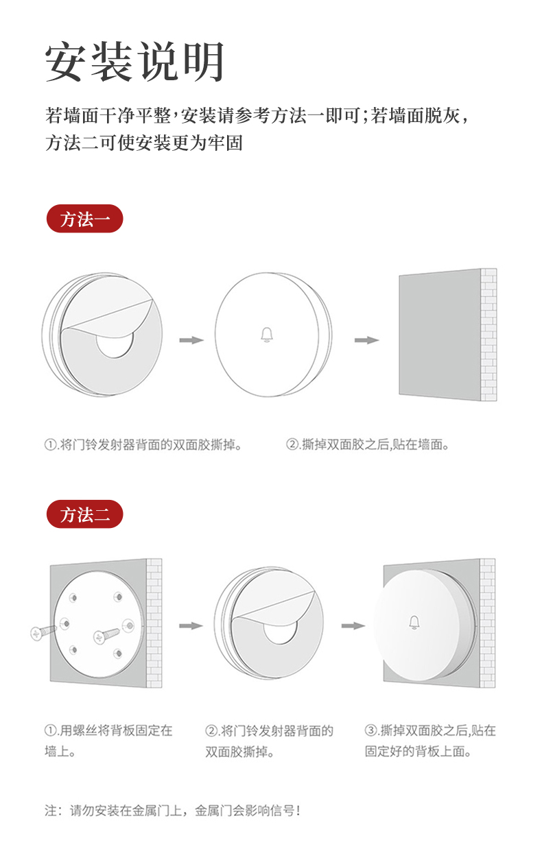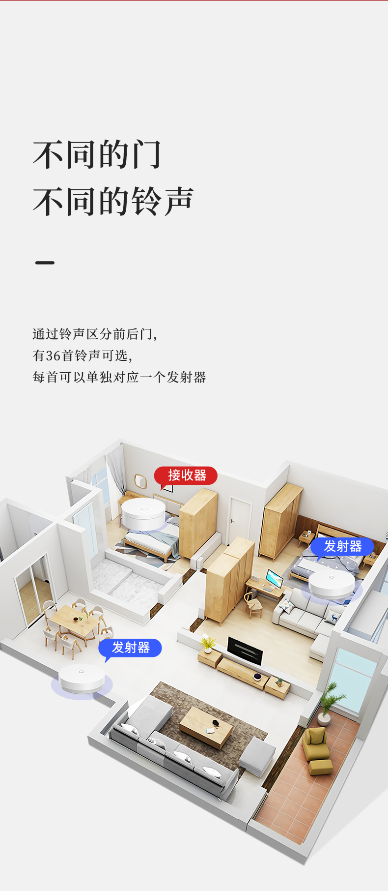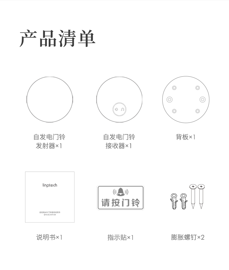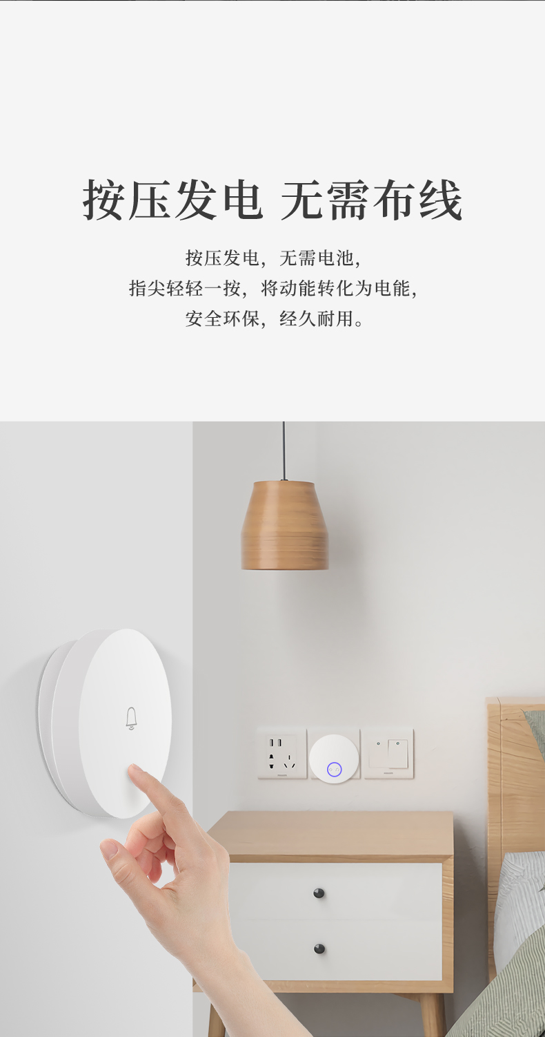linptech是小米生态链旗下品牌,这款无线门铃是其拳头产品,使用非常方便,无需布线和电池,也不怕户型复杂,打开包装直接就能使用,内置36首铃声和5档音量,随心调节,发射器内置自发电模块,每次按压即自动发电,安全省心。