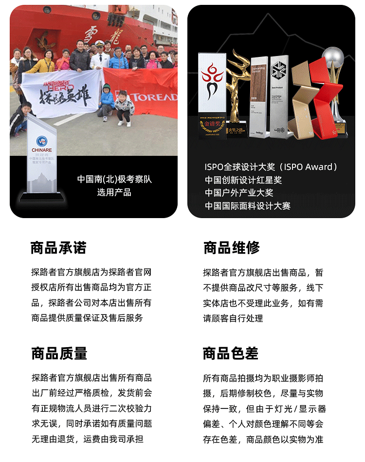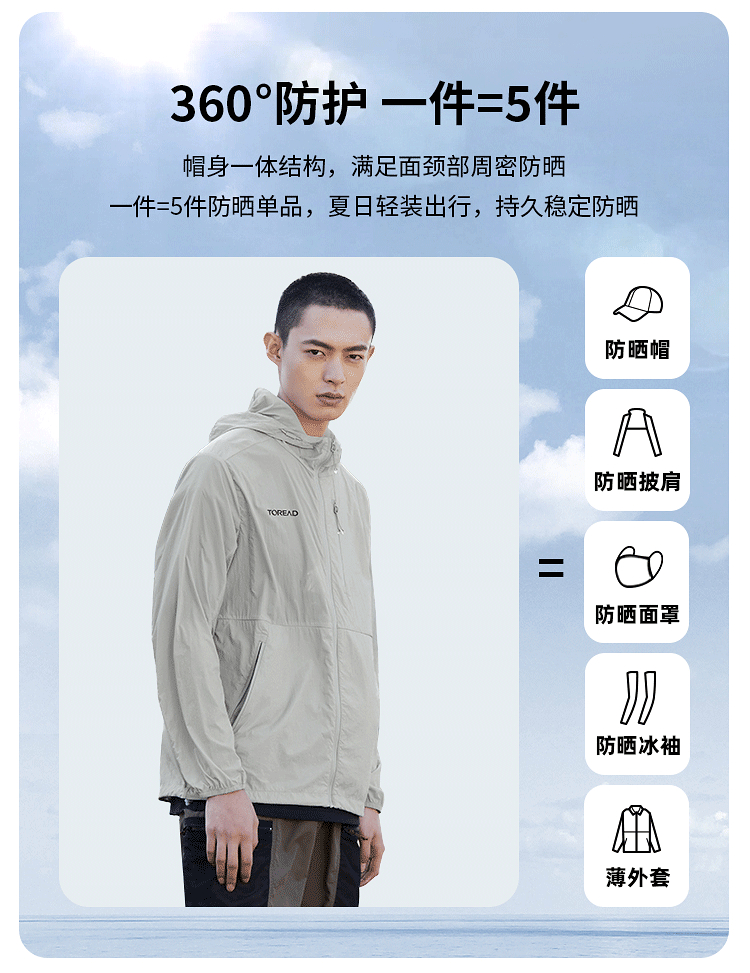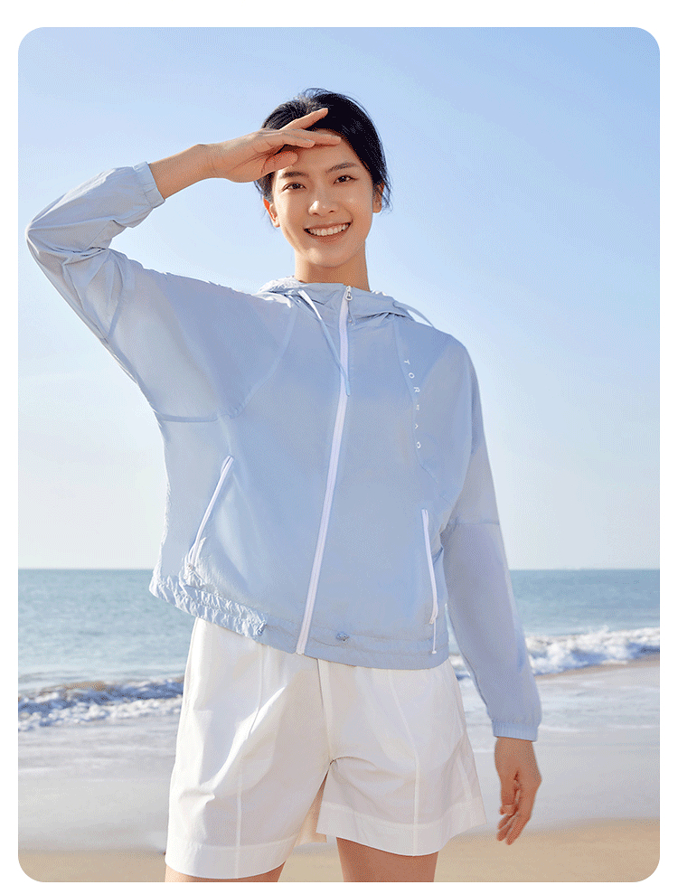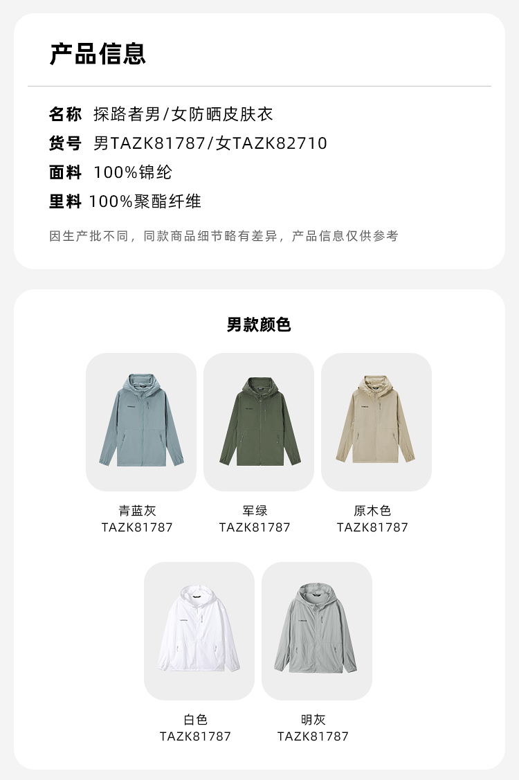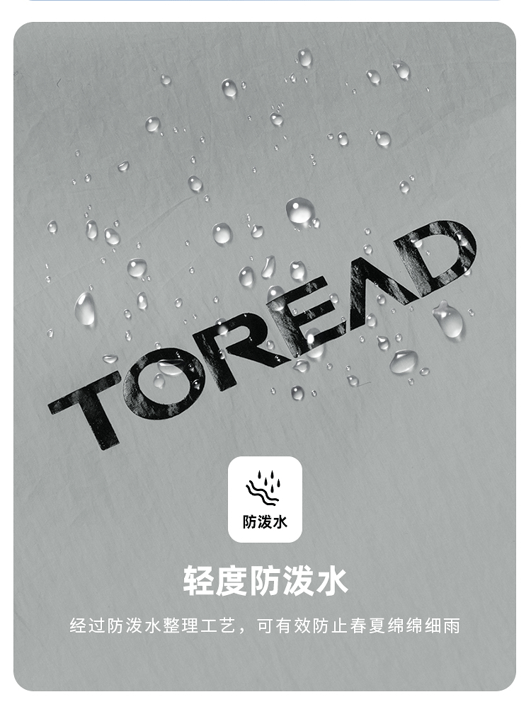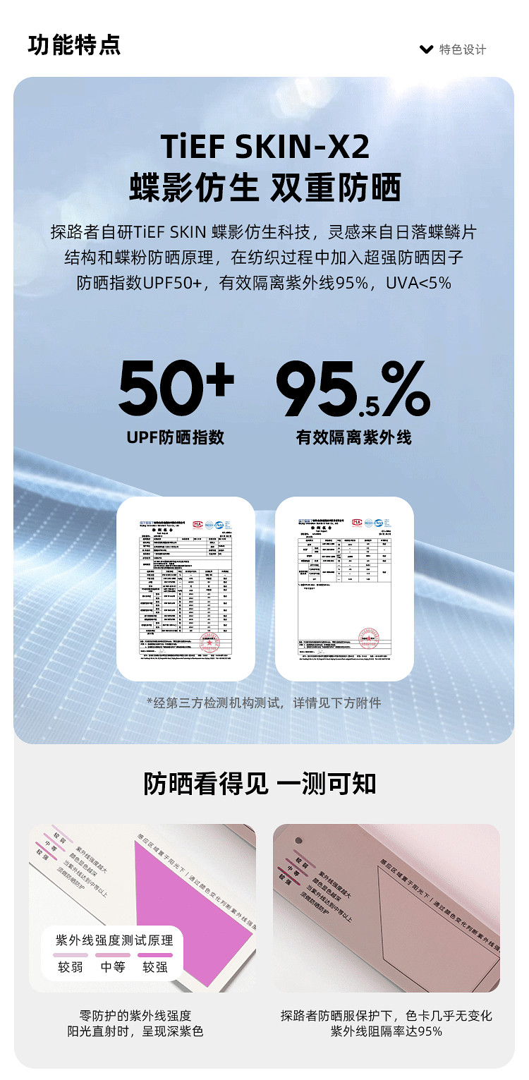 探路者自研TiEF SKIN蝶影仿生科技,灵感来自日落蝶鳞片结构和蝶粉防晒原理,在纺织过程中加入超强防晒因子,防晒指数UPF50+,有效隔离紫外线95%,UVA<5%。面料经过防泼水整理工艺,轻度防泼水,可有效防止春夏绵绵细雨。