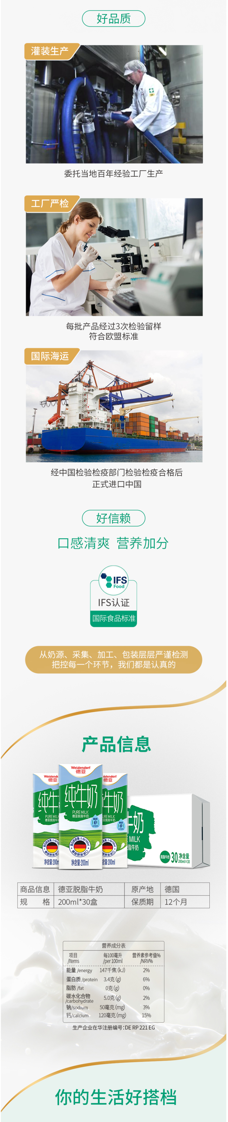 德亚 脱脂纯牛奶,德国原装进口国内灌装。乳源来自澳大利亚自养农场的荷斯坦乳牛,100ml奶中的乳蛋白含量达到了3.4g,脂肪含量为0,减肥人士或者爱美人士可以选用。