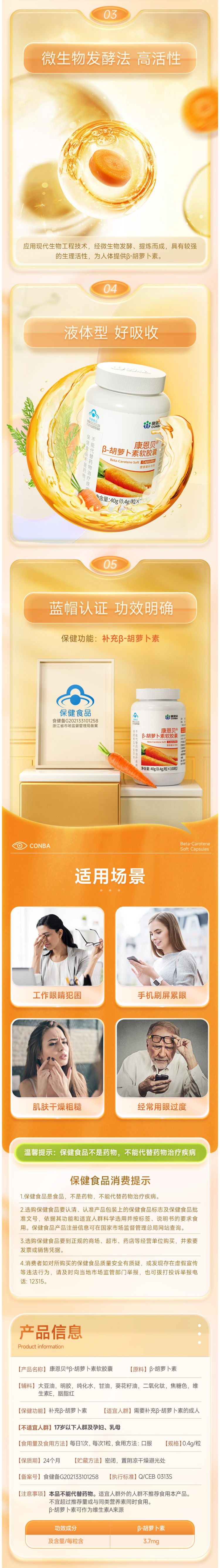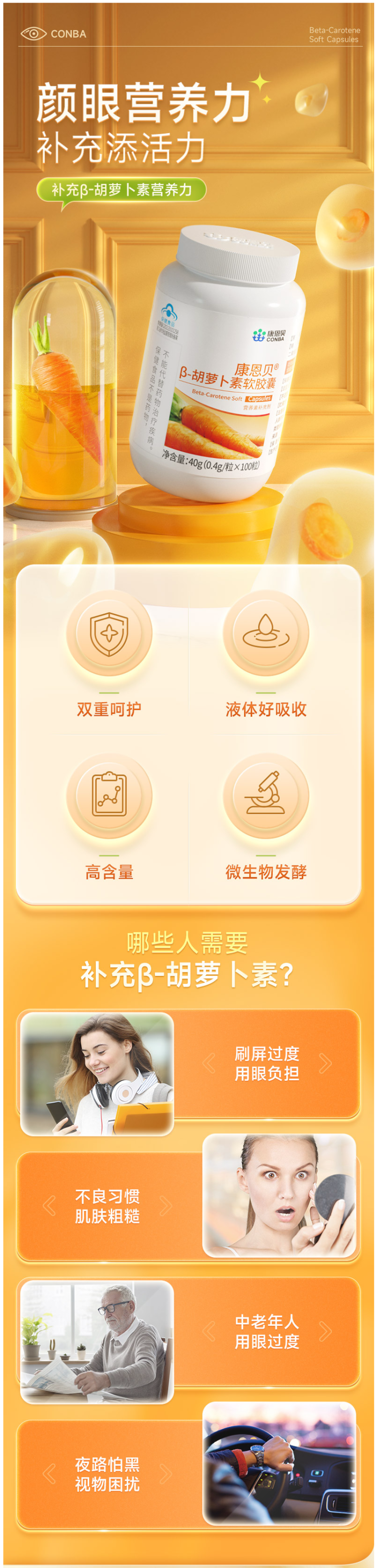 可用于改善暗视力,缓解眼干涩和皮肤干燥,增强抵抗力。保护眼睛,补充β胡萝卜素,适合长期电脑工作者,一天一次,一次一粒,够吃3个多月。