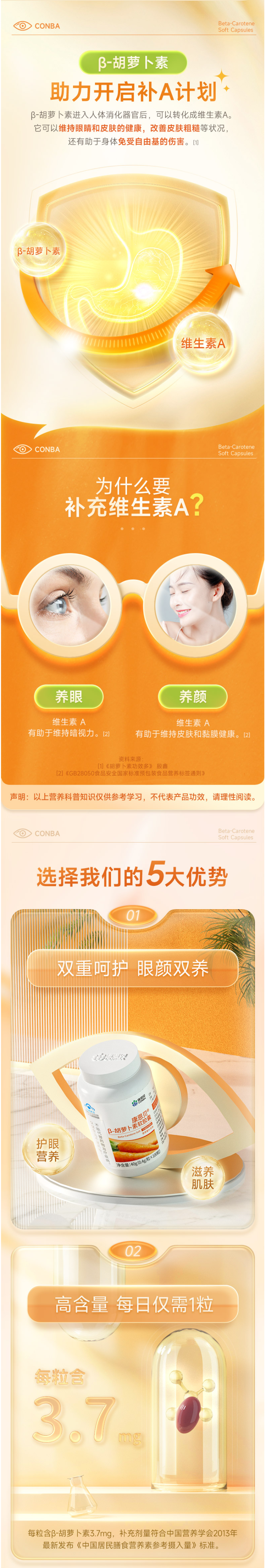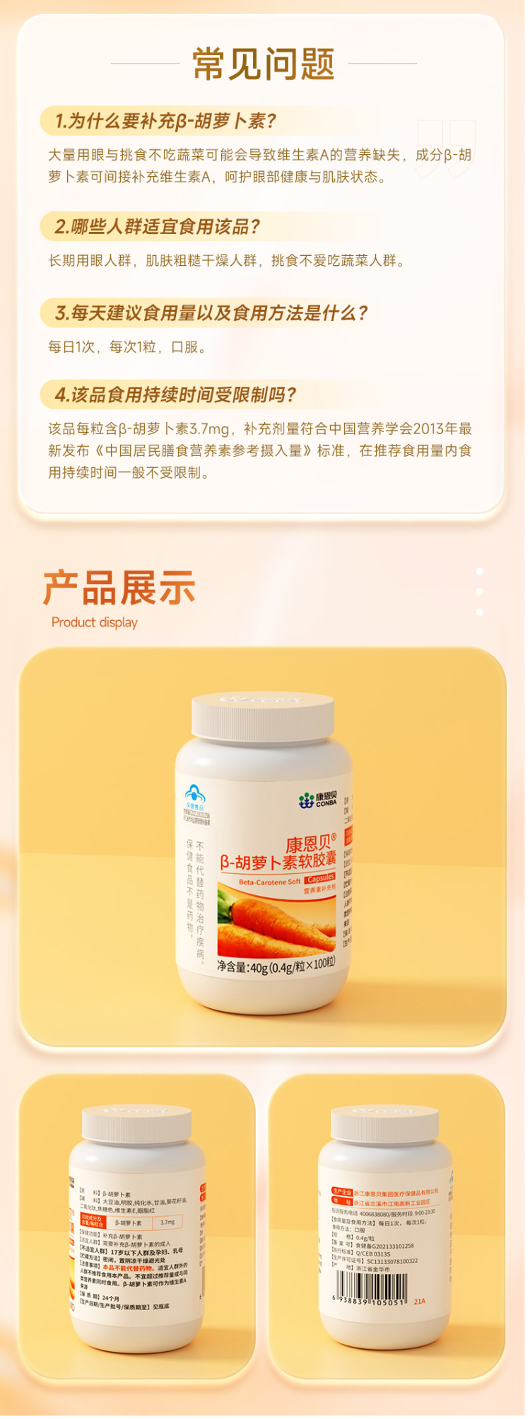 这款康恩贝 β-胡萝卜素软胶囊,100%天然原料提取出的优质β-胡萝卜素,有效成分含量高。应用现代生物工程技术,经微生物发酵、提炼而成,具有较强的生理活性。