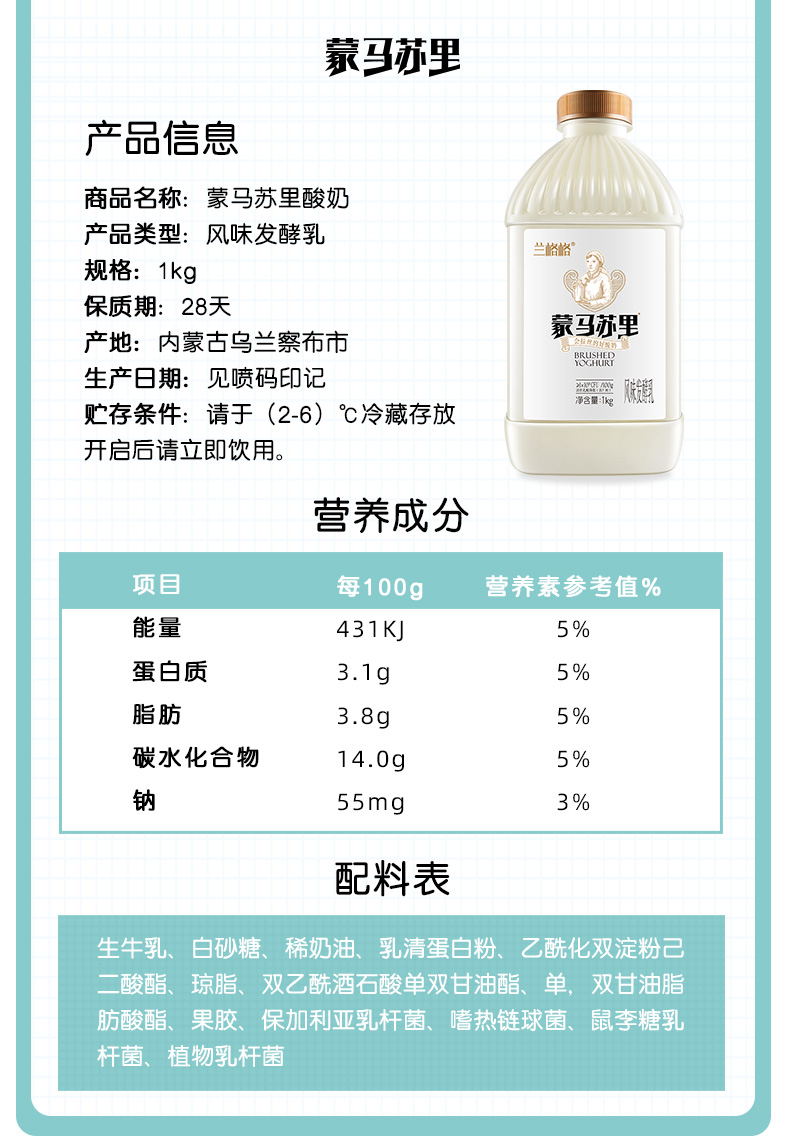 天猫兰格格旗舰53元,可领15元优惠券,实付38元到手,兰格格是内蒙古兰格格乳业有限公司旗下自有品牌,拥有361亩标准欧盟化专属牧场,1082头进口纯种荷斯坦乳牛,牛奶品质优越,日产近10吨鲜奶。这款酸奶小编已经尝过了,酸奶不是非常粘稠,炭烧味的口感偏甜,我比较爱喝。