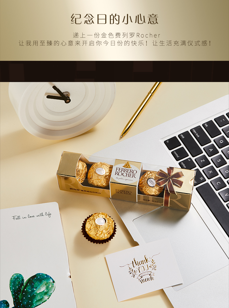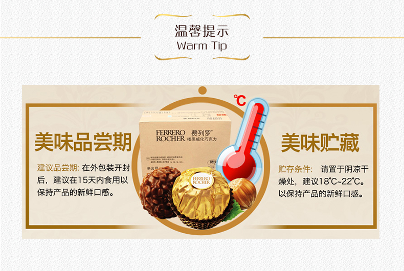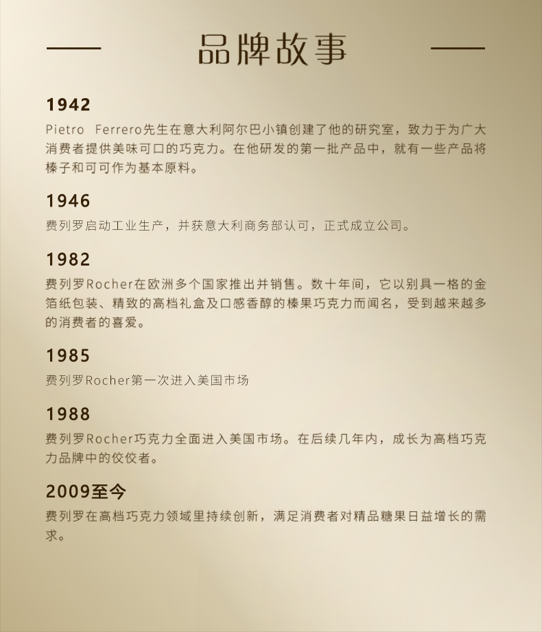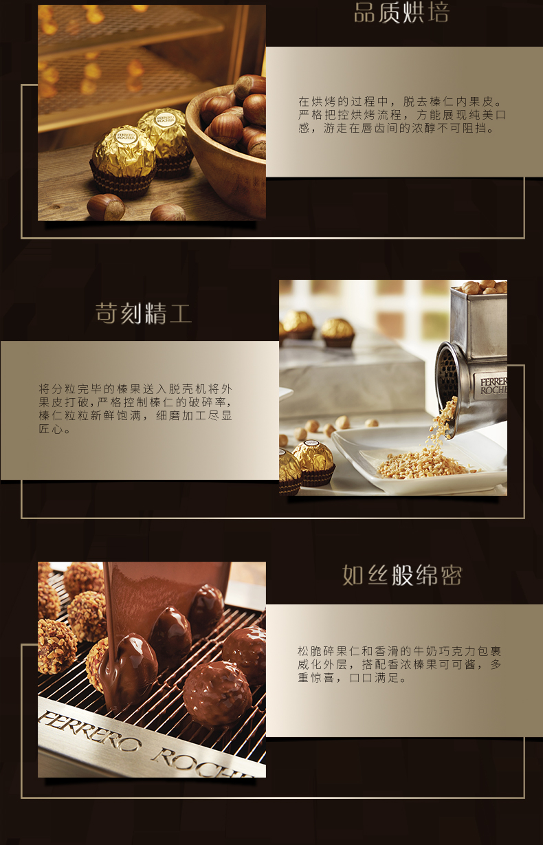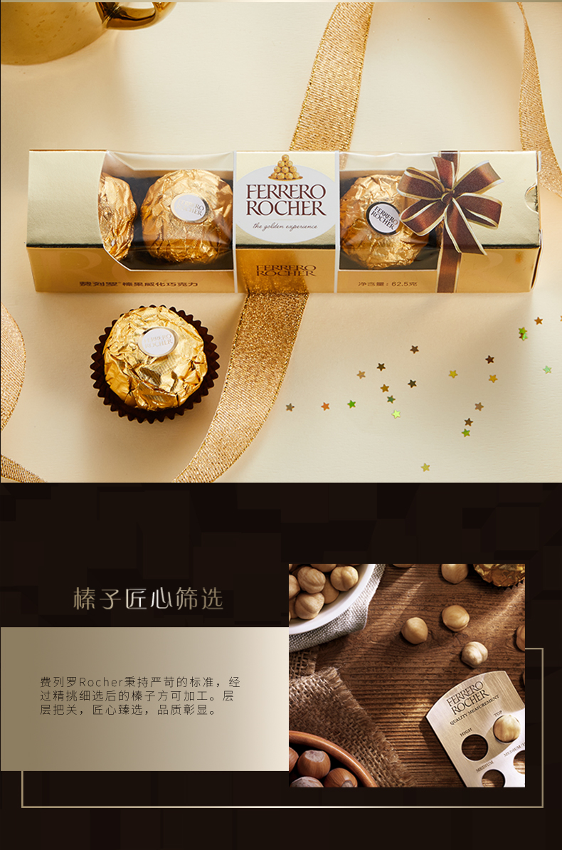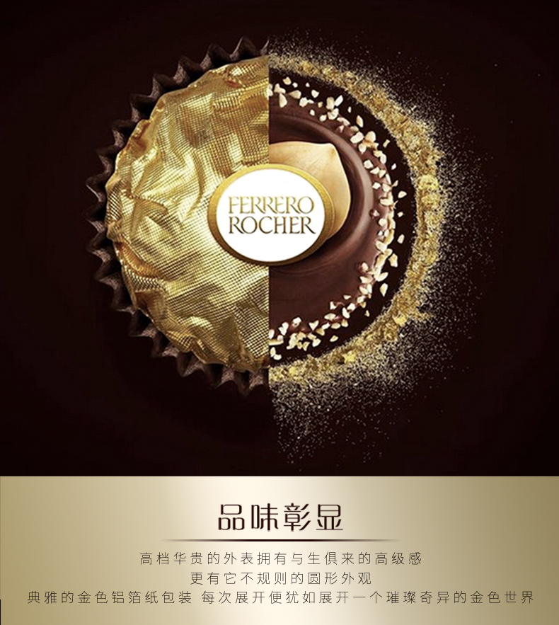 费列罗Rocher原产意大利的世界著名巧克力品牌,是国人比较热衷的巧克力产品。原创配方、精心制作、雅致包装和开创性的推广活动;新颖的形状 – 圆形却不规则 – 与金箔纸独立包装,让其尽显典雅华贵;独特风味呼之欲出:外层香浓巧克力,内有松脆威化及香滑榛果可可酱和原粒榛果,带来多种口感的享受。