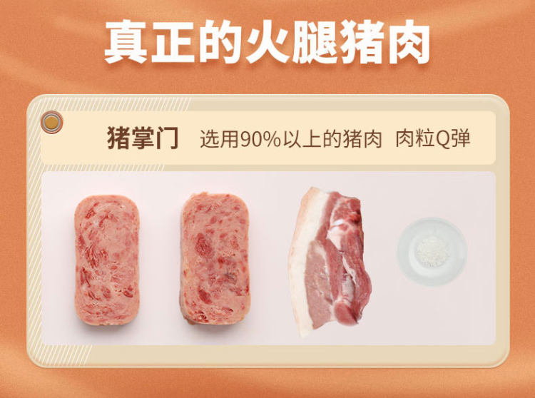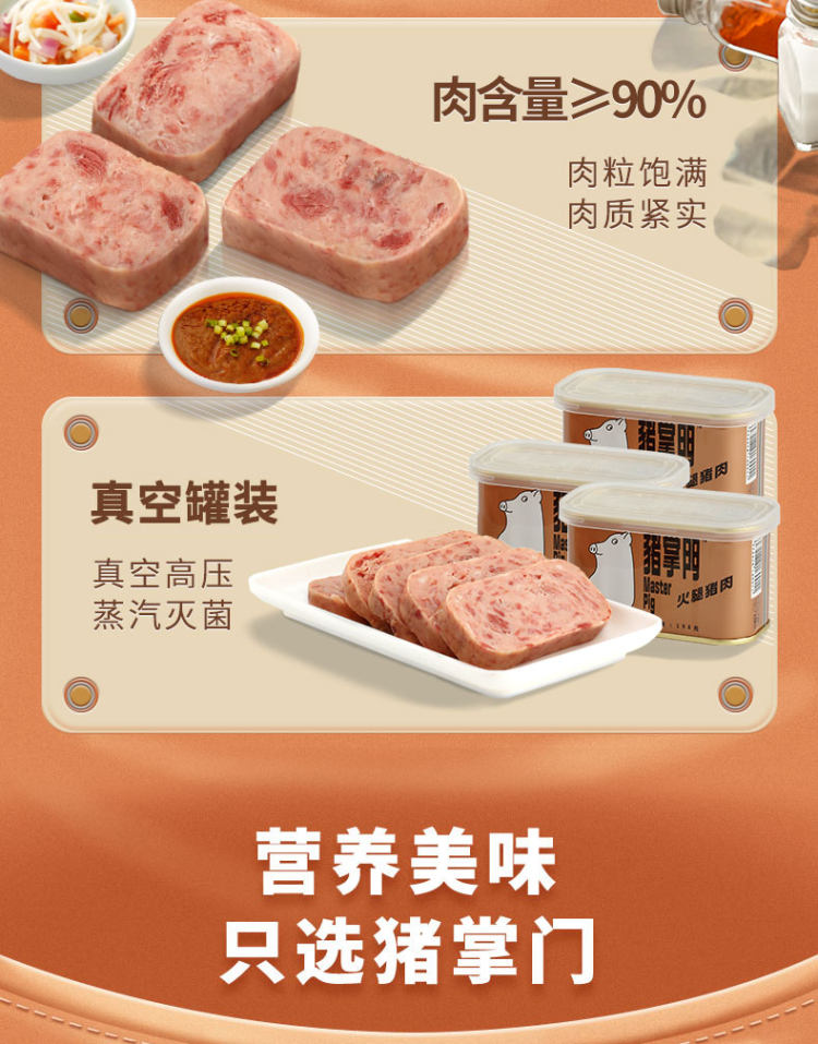 这款猪掌门火腿罐头猪肉含量大于90%,精选优质猪后腿肉,肉质紧致,美味可口,大块肉粒看得见。且不含色素香精,无菌封罐,绝无防腐剂,部门检验合格,健康放心。经典品牌,涮火锅、元气早餐、配餐必备。规格为198g*3罐。