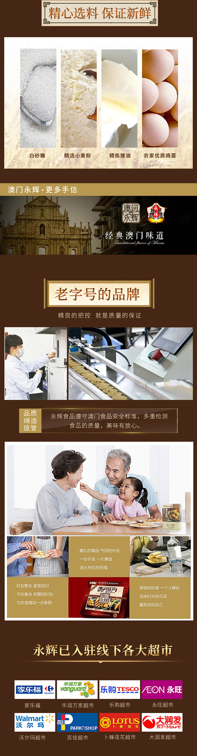 澳门永辉始创于80年代,是来自澳门手信老字号的代表,是传统特色产品的产销一体化企业,80年代初首创椰汁蛋卷皇、紫菜肉松凤凰卷、粒粒杏仁饼并延续至今。澳门永辉初创时,专供澳门各大手信饼家及超市,是澳门首家蛋卷、西饼OEM供应商,专业生产澳门特产。