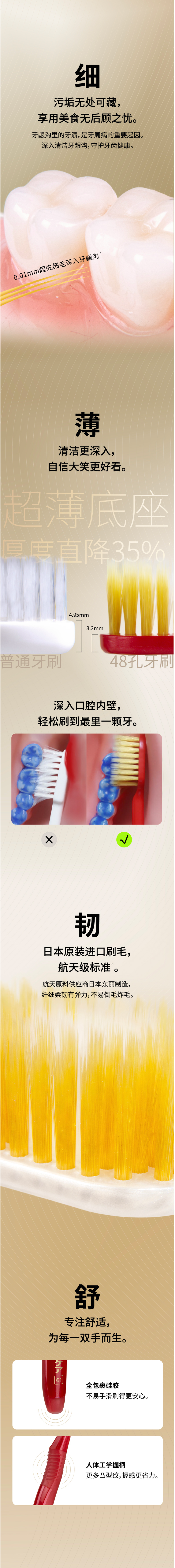 这款牙刷48孔大宽头设计,毛孔数是普通刷头的1.8倍,能大面积的覆盖上下牙齿和牙龈,双层不同柔软度的刷毛设计,柔与力兼施,清洁与按摩兼备,呵护娇嫩牙龈。同时也是平尖两种刷毛的组合,丝径20微米的「超纤细尖毛」,能深入清洁牙龈沟,「平切毛」能清洁齿面色渍和污垢。