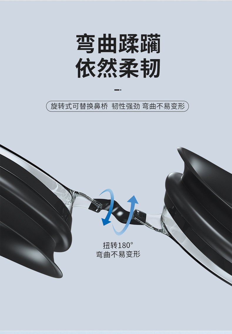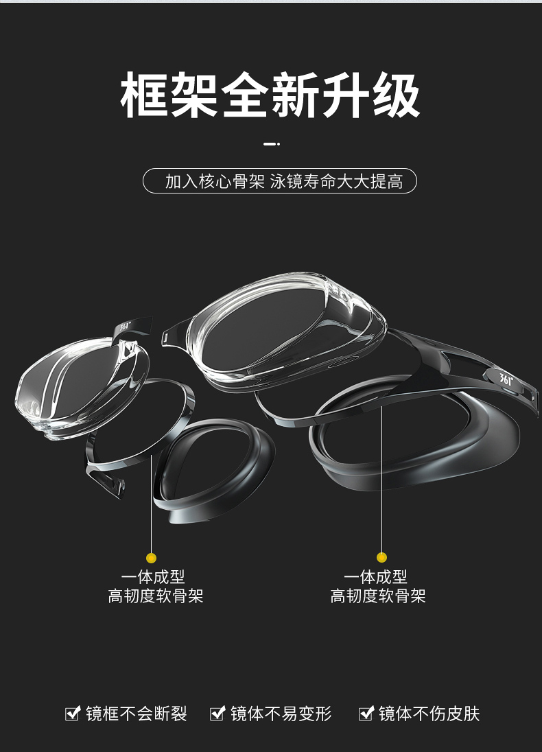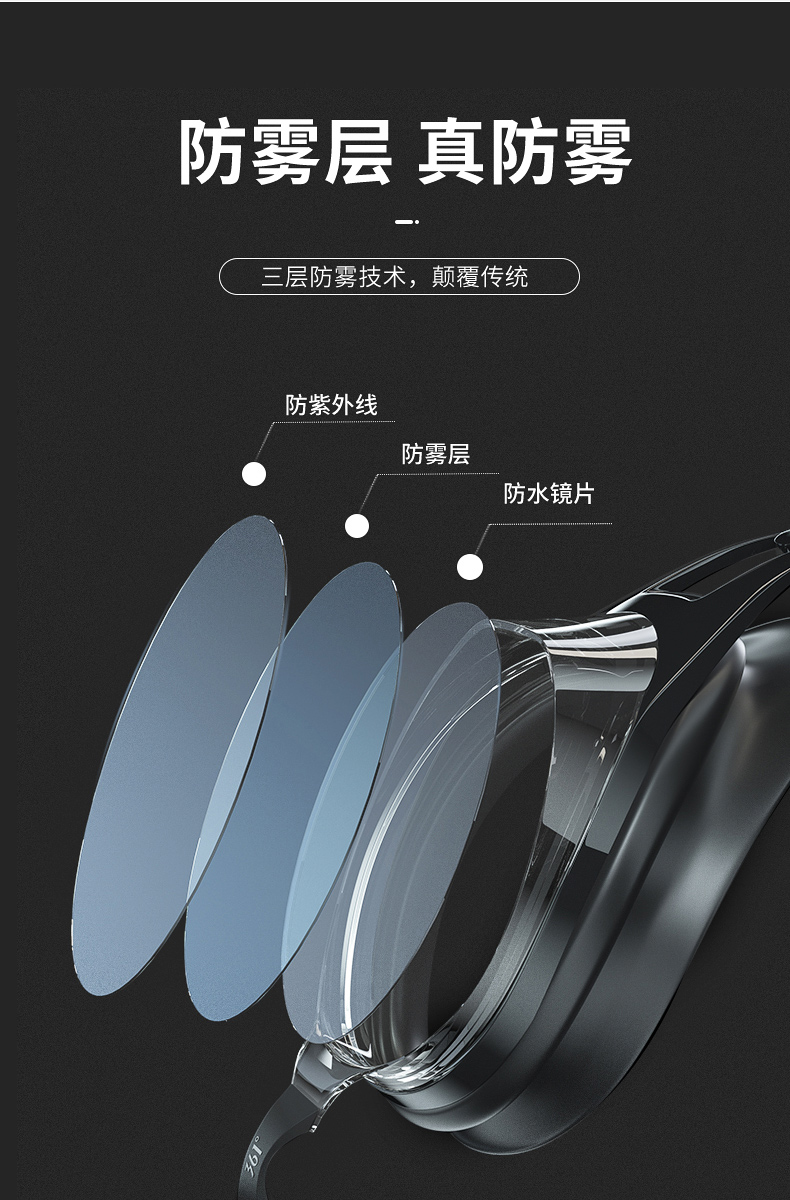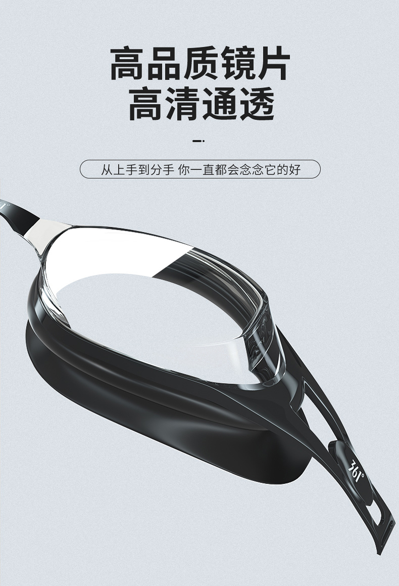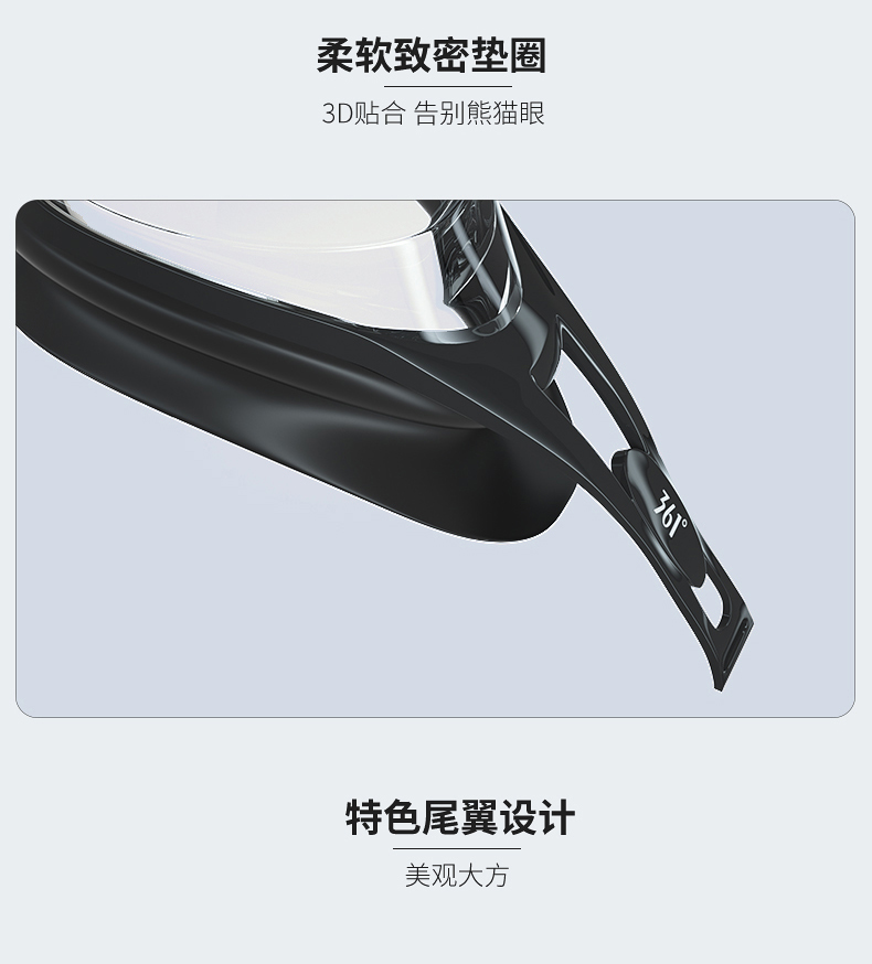 这款361度防水防雾高清泳镜,一体成型的高韧度软骨架,镜框不会断裂,镜体不易变形、伤肤;镜片是防紫外线+防水镜片+防雾层的组合,高清通透。旋转式可替换鼻桥,韧性强劲,弯曲不易变形。
