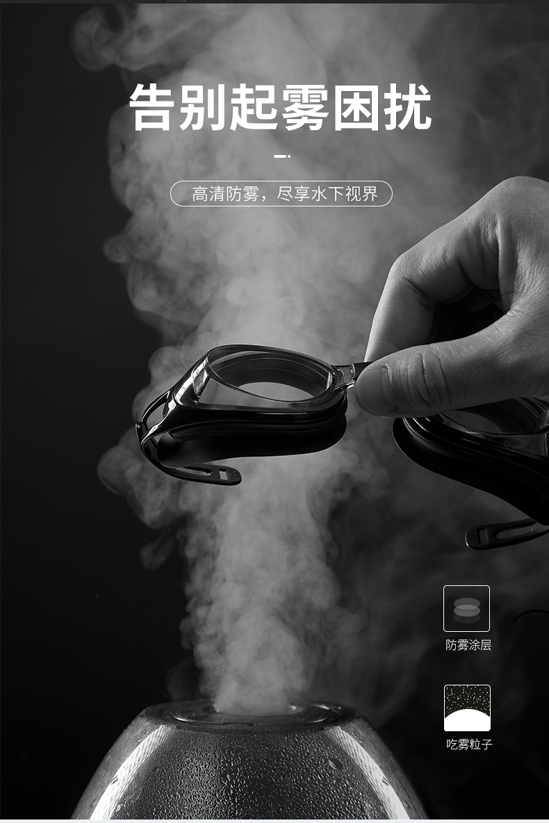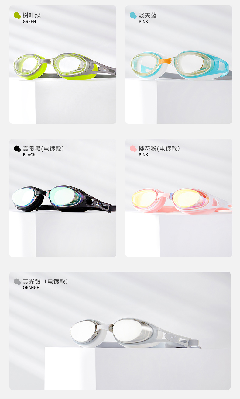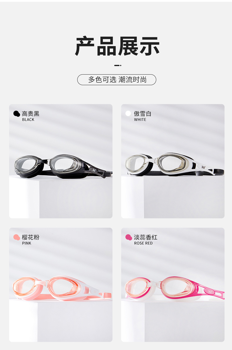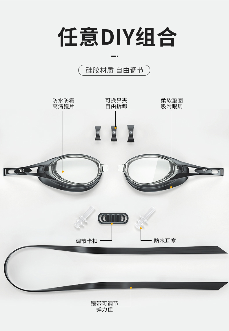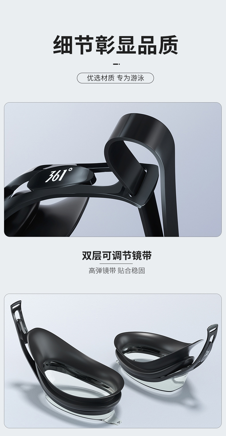 这款361度防水防雾高清泳镜,一体成型的高韧度软骨架,镜框不会断裂,镜体不易变形、伤肤;镜片是防紫外线+防水镜片+防雾层的组合,高清通透。旋转式可替换鼻桥,韧性强劲,弯曲不易变形。
