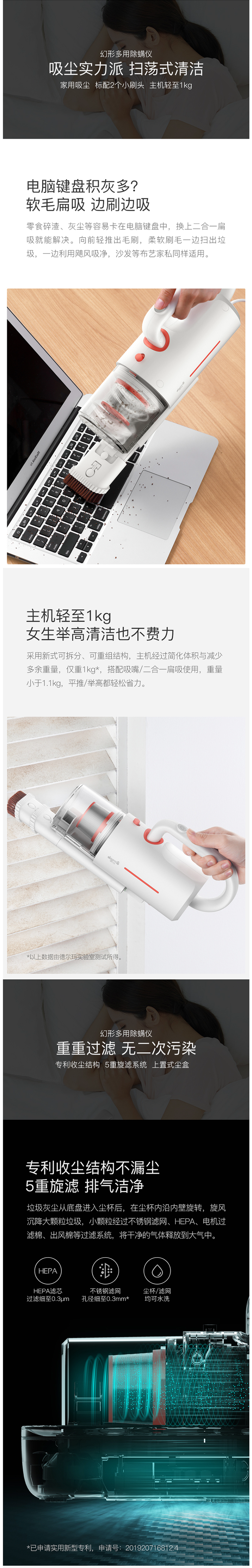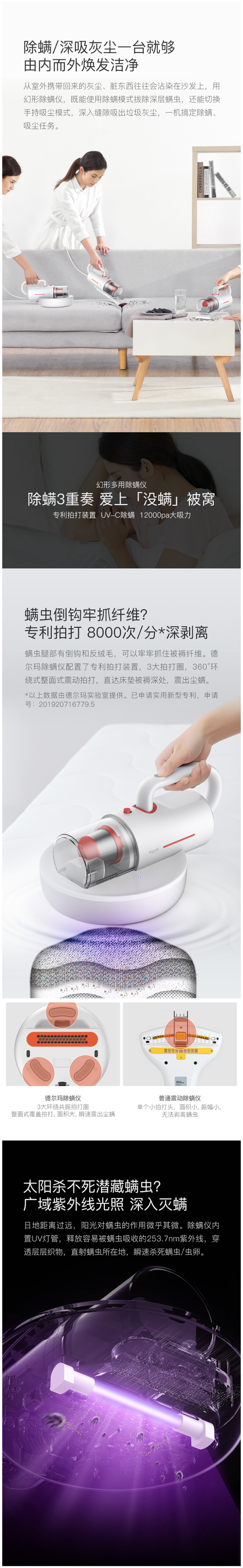 每分钟8000次专利拍打装置、12000Pa大吸力,在配合紫外线灯管既可以有效除螨,专利收尘装置,过滤排出清洁空气,避免二次污染;杀菌除螨率达到大于99.9%。