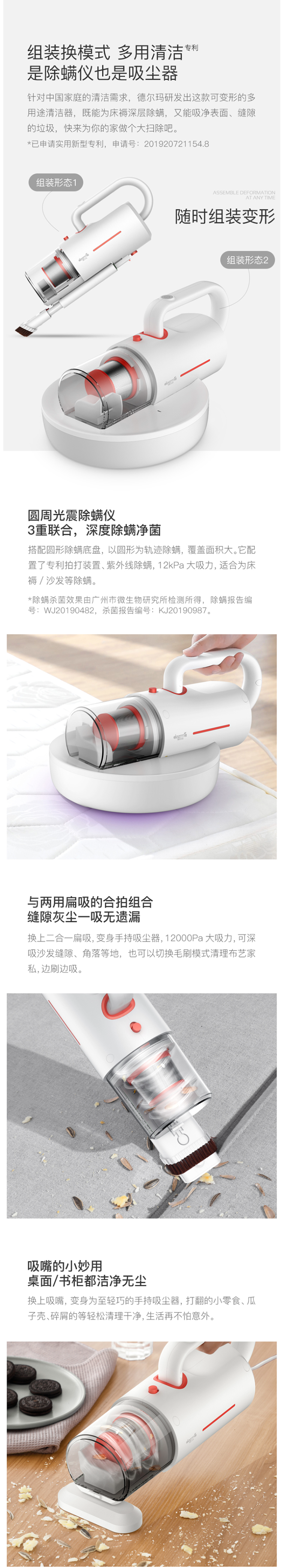 德尔玛 多功能除螨仪,可组装变形除螨仪、吸尘器。紫外线大吸力除螨,圆形除螨底盘,覆盖面积更大;搭配二合一两用吸嘴,变身吸尘器,吸无遗漏,一机多用,非常方便。