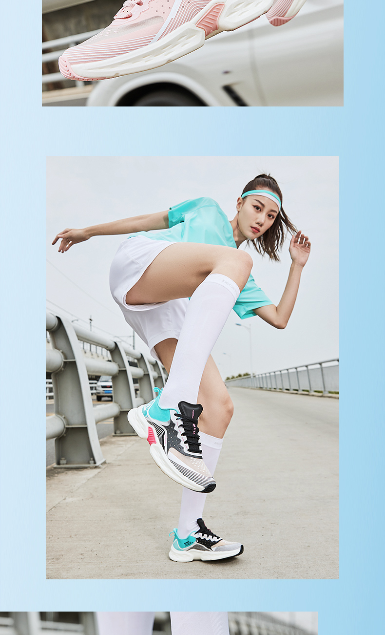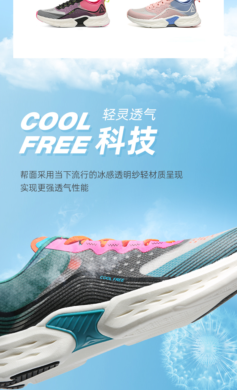 鞋面是搭载COOL FREE科技的冰感透明纱材质,轻灵透气,保持更强的透气性能,其它的细节方面,中底融合了轻质TPU,保持中底在运动时的稳定性和抗扭性,鞋底分块橡胶材质,防止中底的过度磨损,提高整鞋的耐用性。