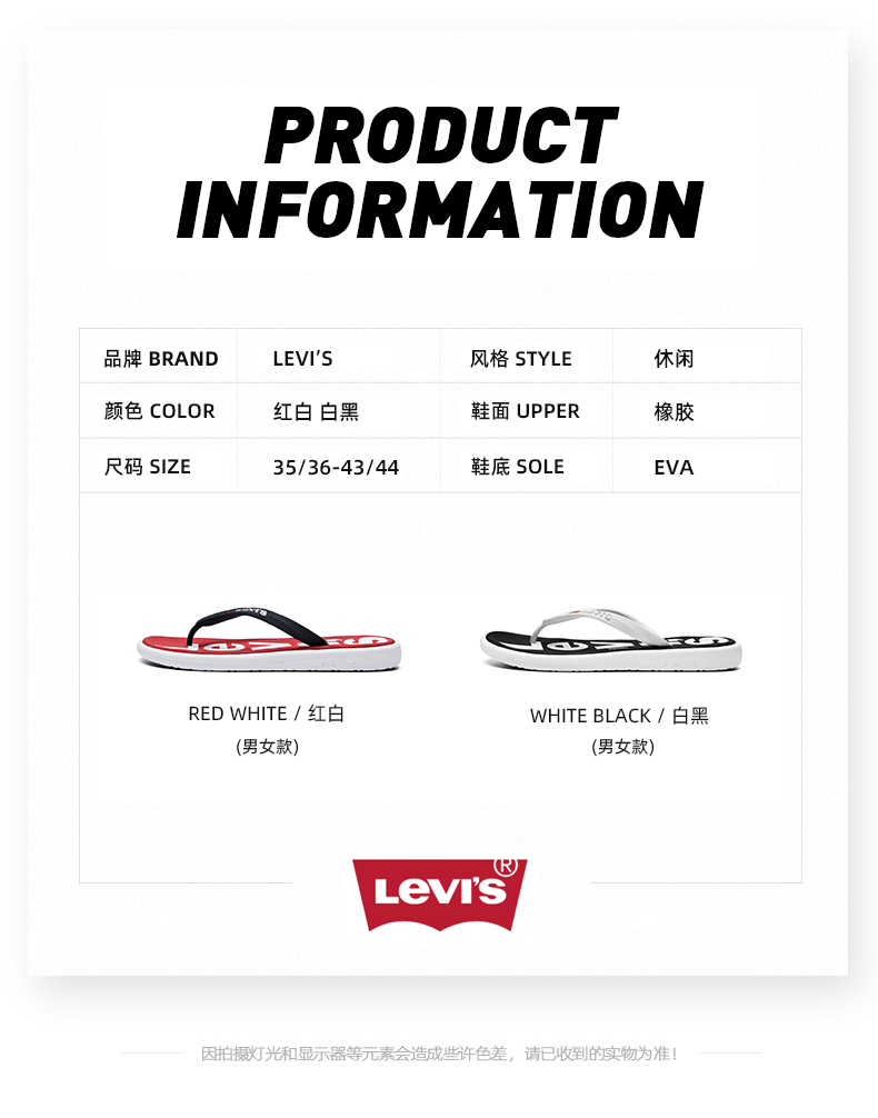 这款Levi’s 李维斯 2022夏季外穿沙滩鞋情侣款潮人字拖,采用柔韧耐用的橡胶材质制作,条带柔边设计,舒适贴合不磨脚;时尚花纹颜色融入,大气有型,兼具潮流气质,轻盈的质感,弹力支撑足部;EVA材质制作大底,水波纹肌理设计,防滑耐磨。