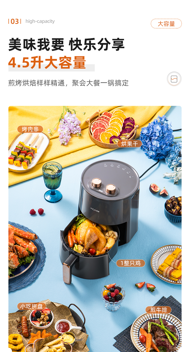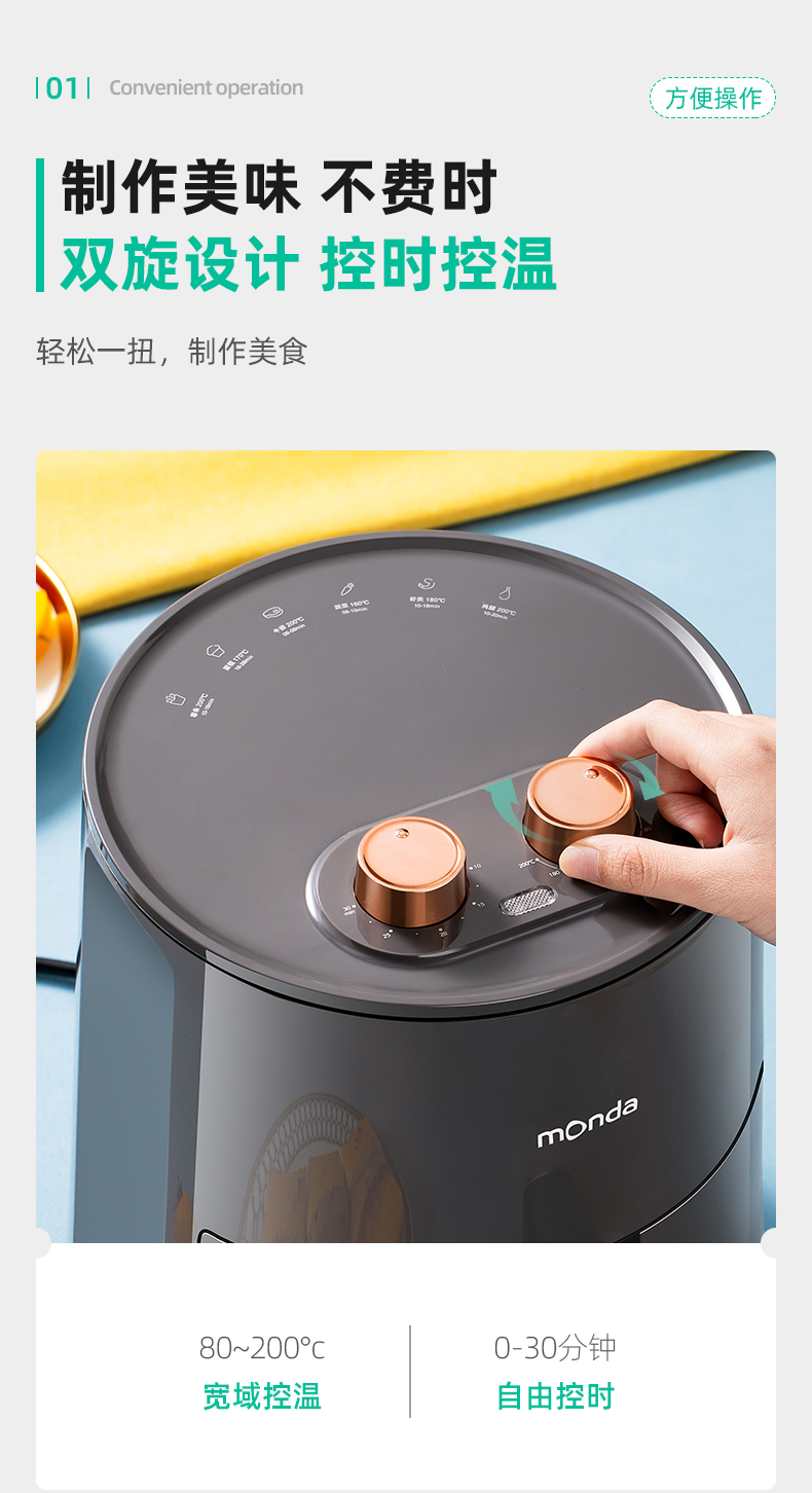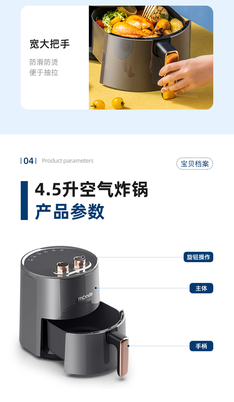 这款Monda AF-19-11 空气炸锅,4.5L大容量,抽桶即断电,可以随时添料尝味或放入食物续炸;双旋钮设计,分别控时控温。