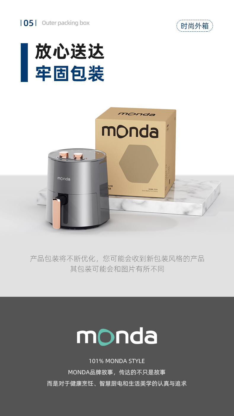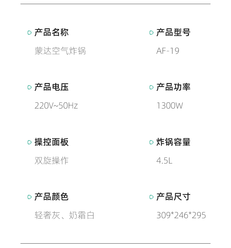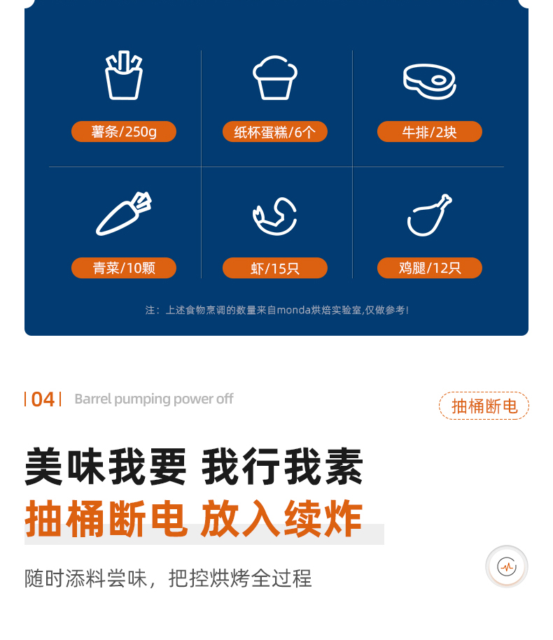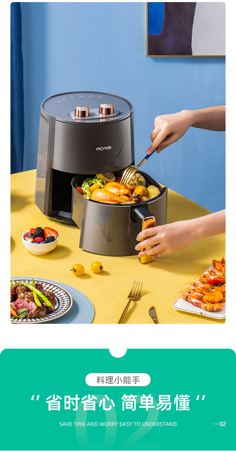 这款Monda AF-19-11 空气炸锅,4.5L大容量,抽桶即断电,可以随时添料尝味或放入食物续炸;双旋钮设计,分别控时控温。