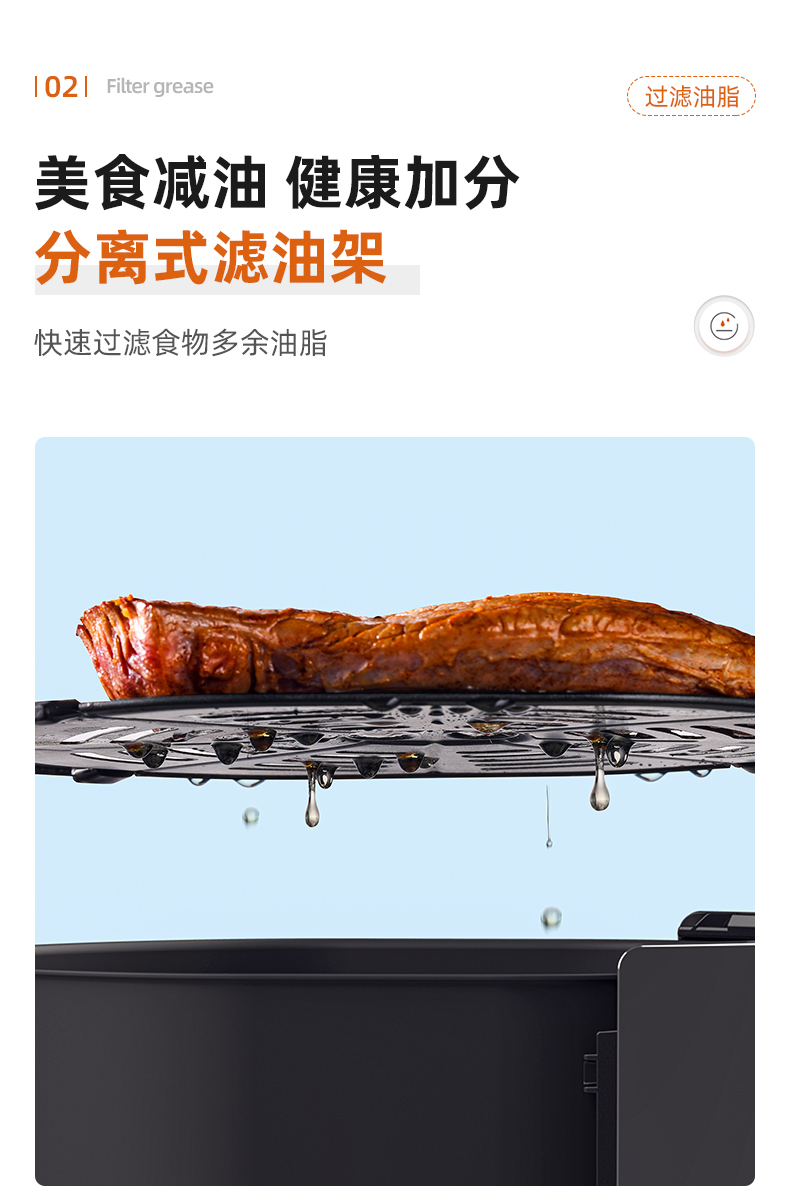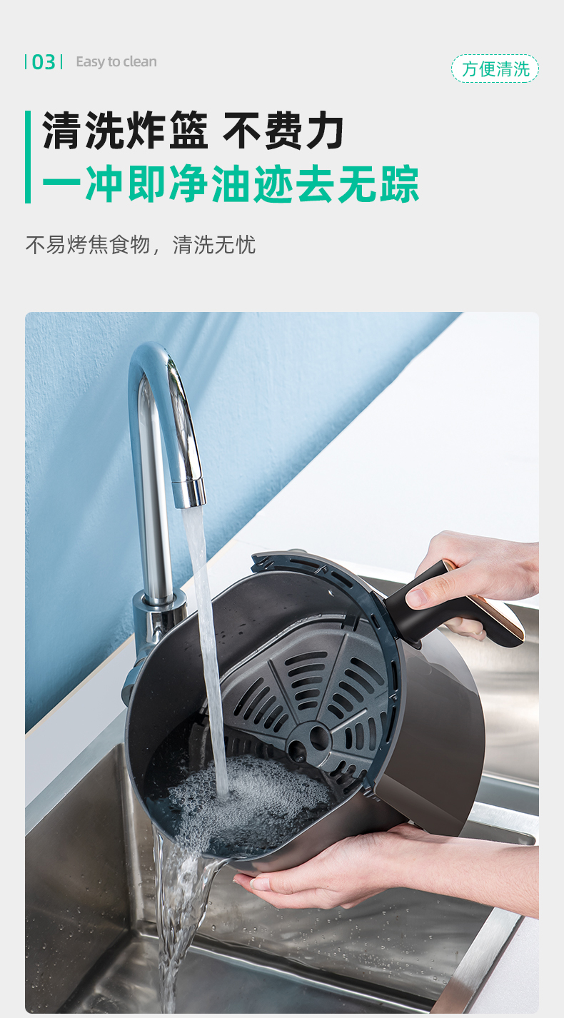 内腔是一体式设计,有不粘油涂层,炸篮和炸锅运用分离技术,按下释放按钮,轻松分离炸蓝和锅底,不粘油更易清洗;锅内容量是4.5L,能满足8-10人可用,一般的空气炸锅只有2L。