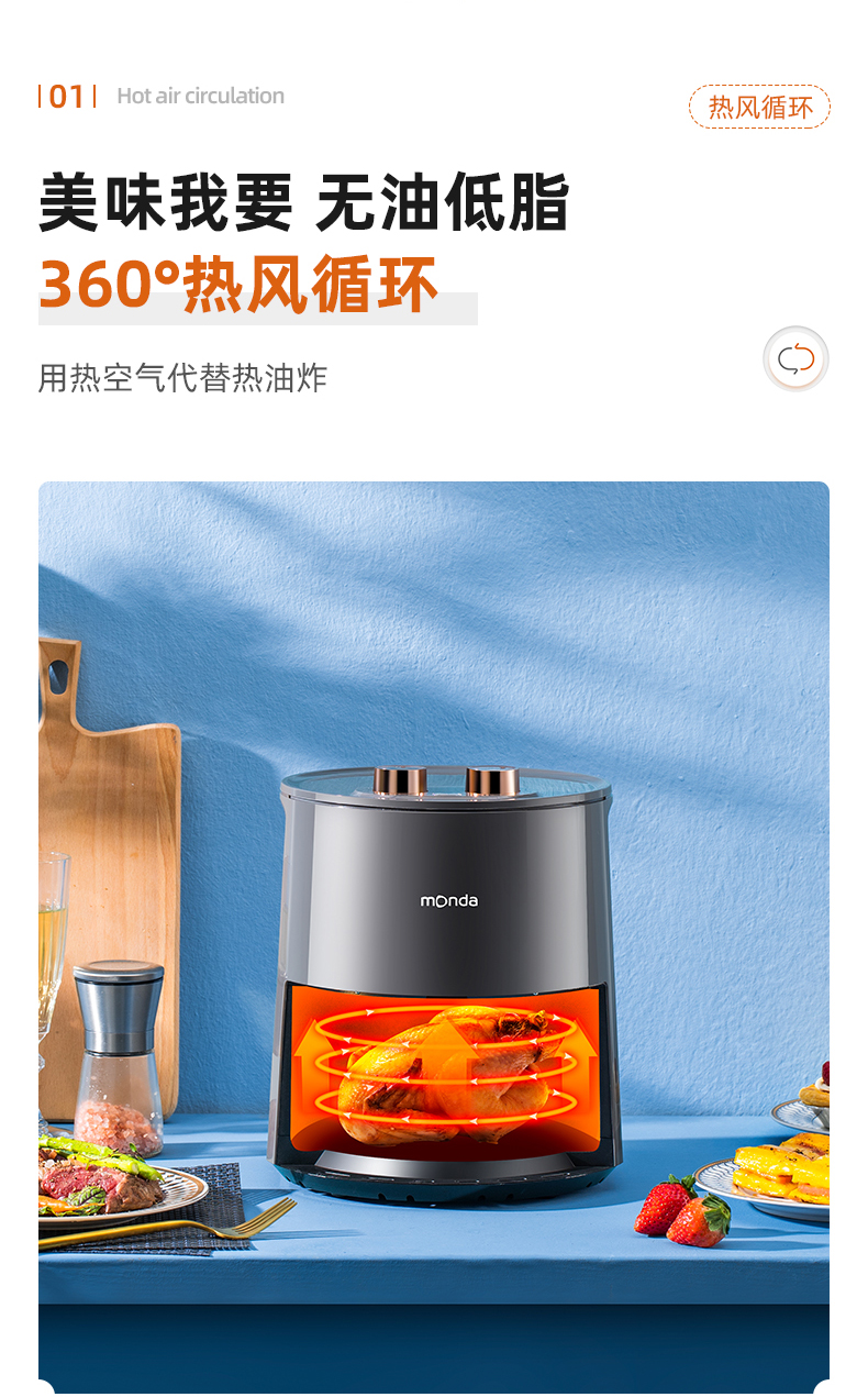 空气炸锅主要是通过空气循环加热锅内空气快速加热和脆化食物,360°无死角热风高转加热使食物受热均匀,外酥里嫩,同时锁住营养和水份,过滤多余油脂。